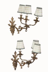 Coppia di appliques a tre luci in bronzo dorato. XX secolo