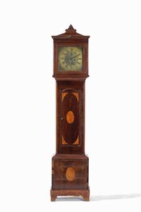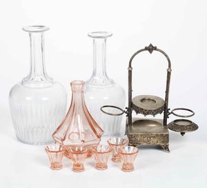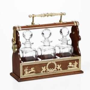Set di tre bottiglie da liquore in vetro entro custodia in legno con finimenti in [..]
