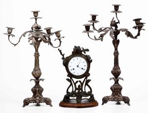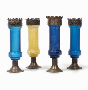 Gruppo di quattro candelieri in vetro e metallo. XX secolo