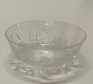 Ciotola in vetro incolore decorata con rose in rilievo.
