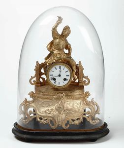 Pendola da tavolo in metallo dorato, sotto campana di vetro