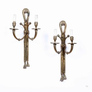 Coppia di appliques a due luci in metallo dorato in forma di nastri. XIX-XX seco [..]