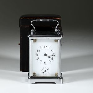Officielle con sveglia. Cassa in metallo bianco con astuccio in pelle.