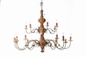 Lampadario in legno e metallo a diciotto luci su due ordini