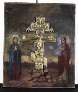 Icona con crocifissione in bronzo fuso e dorato. Scuola russa XIX secolo.