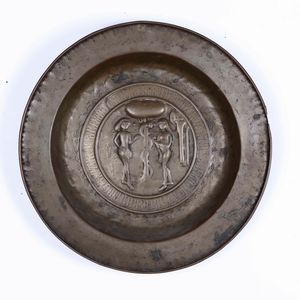 Piatto elemosiniere in ottone sbalzato e cesellato. Germania XVI secolo