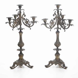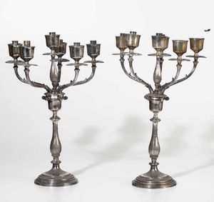 Coppia di candelabri in metallo argentato a cinque luci, XX secolo