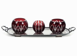 Lotto di tre vasi in vetro, uno Fabergé, misure diverse