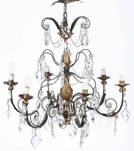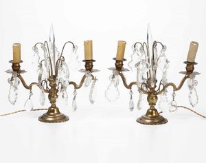 Coppia di girandoles a due luci in metallo dorato e cristalli