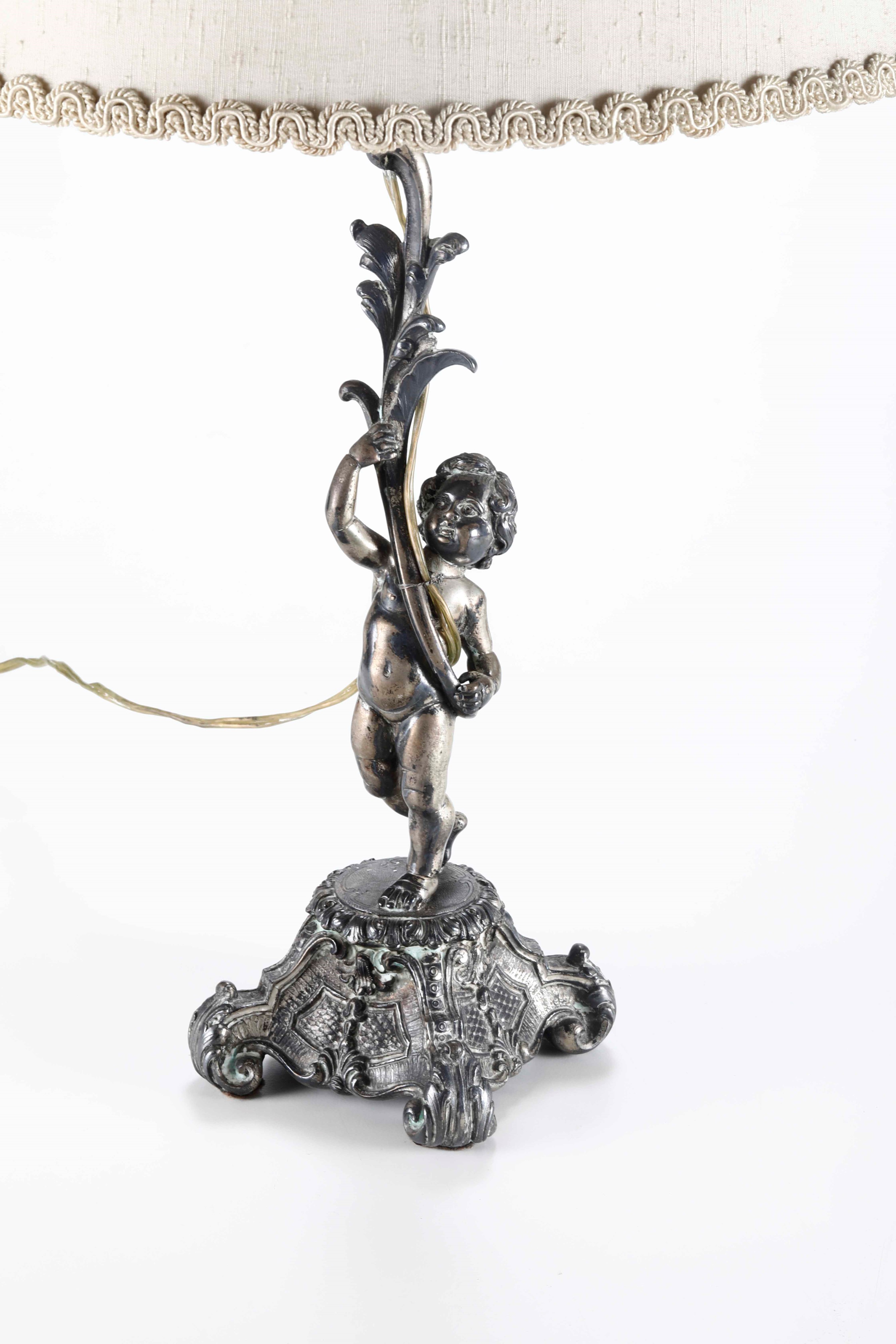 Candeliere con putto in metallo argentato. Montato a lampada. Stile 700