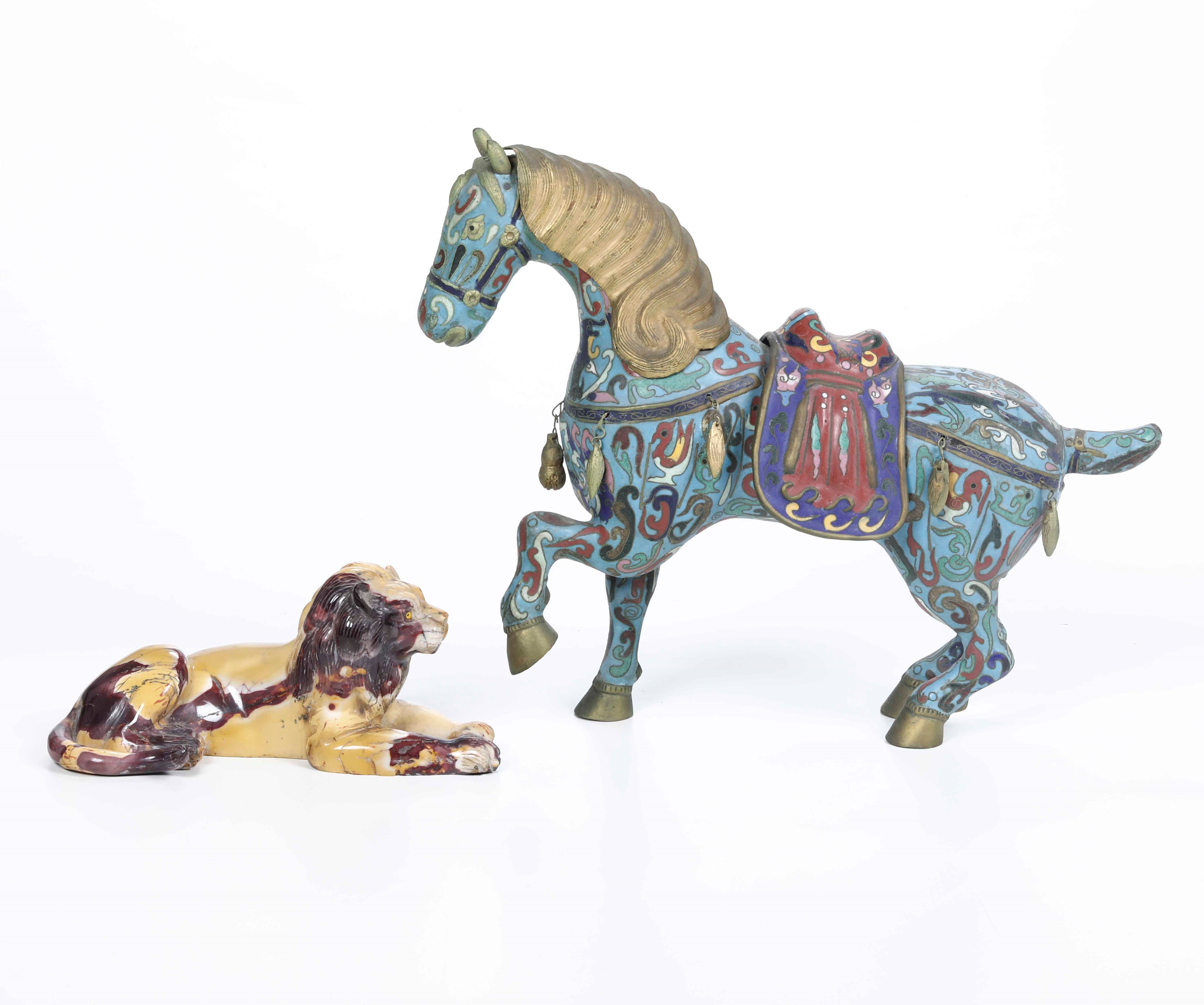 Cavallo in smalti cloisonnè e leone in pietra dura