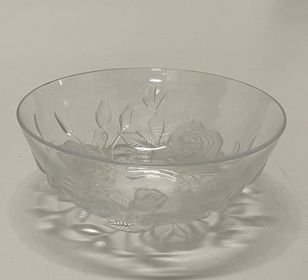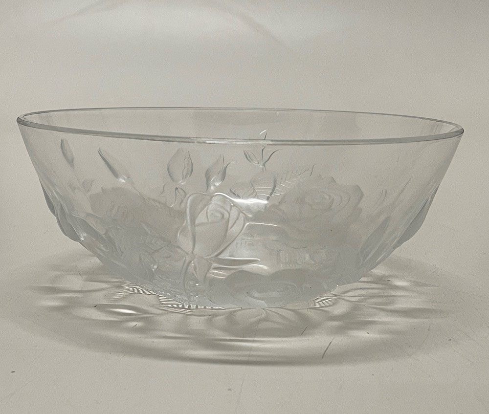 Ciotola in vetro incolore decorata con rose in rilievo.