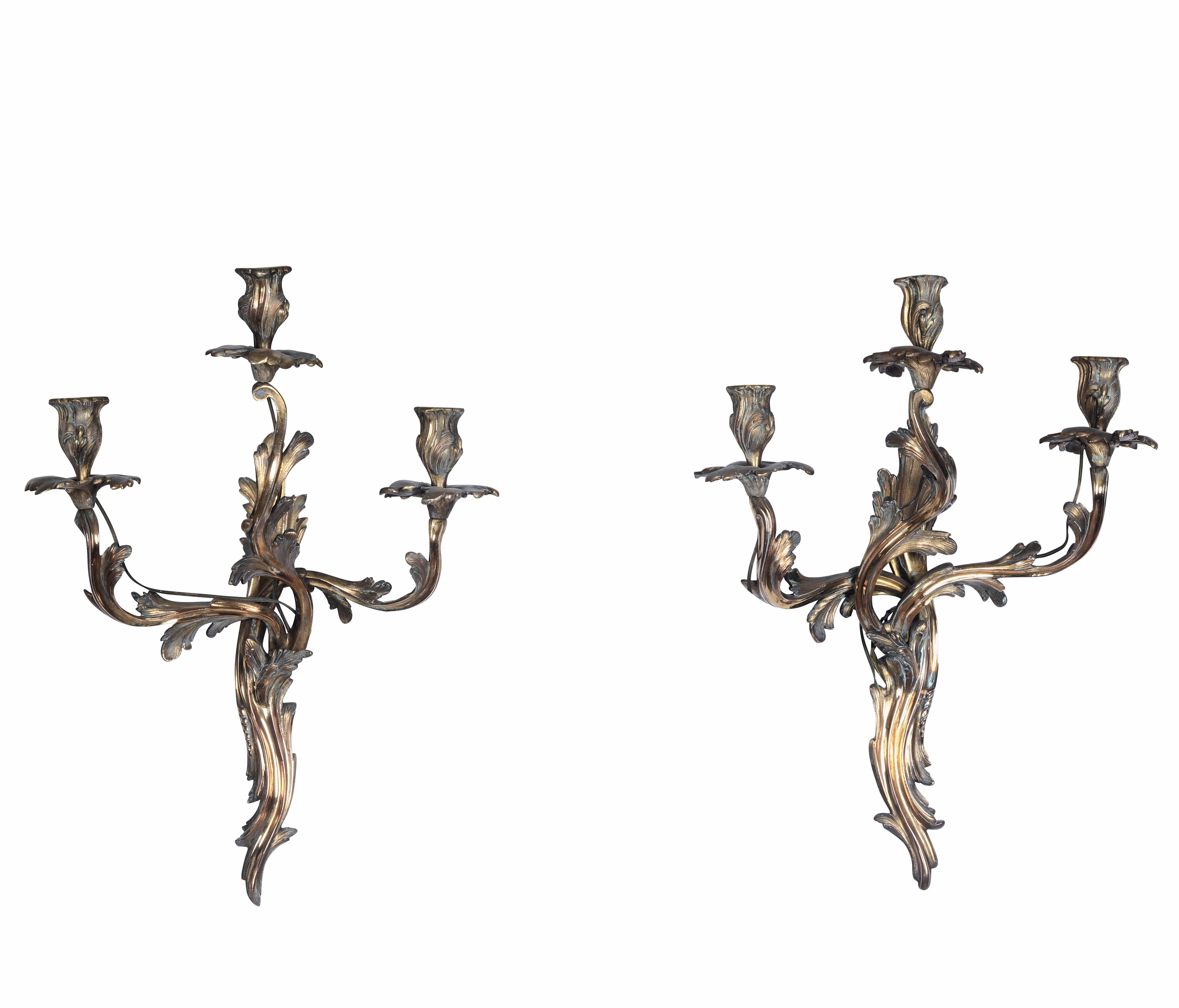 Coppia di appliques a tre luci in bronzo dorato, XX secolo