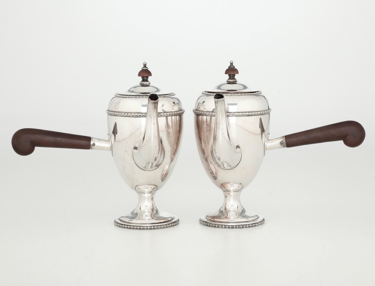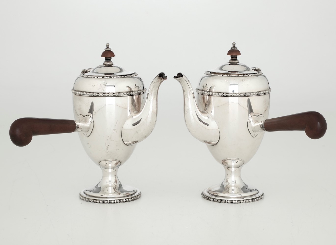 Coppia di cioccolatiere in metallo argentato. Italia XX secolo