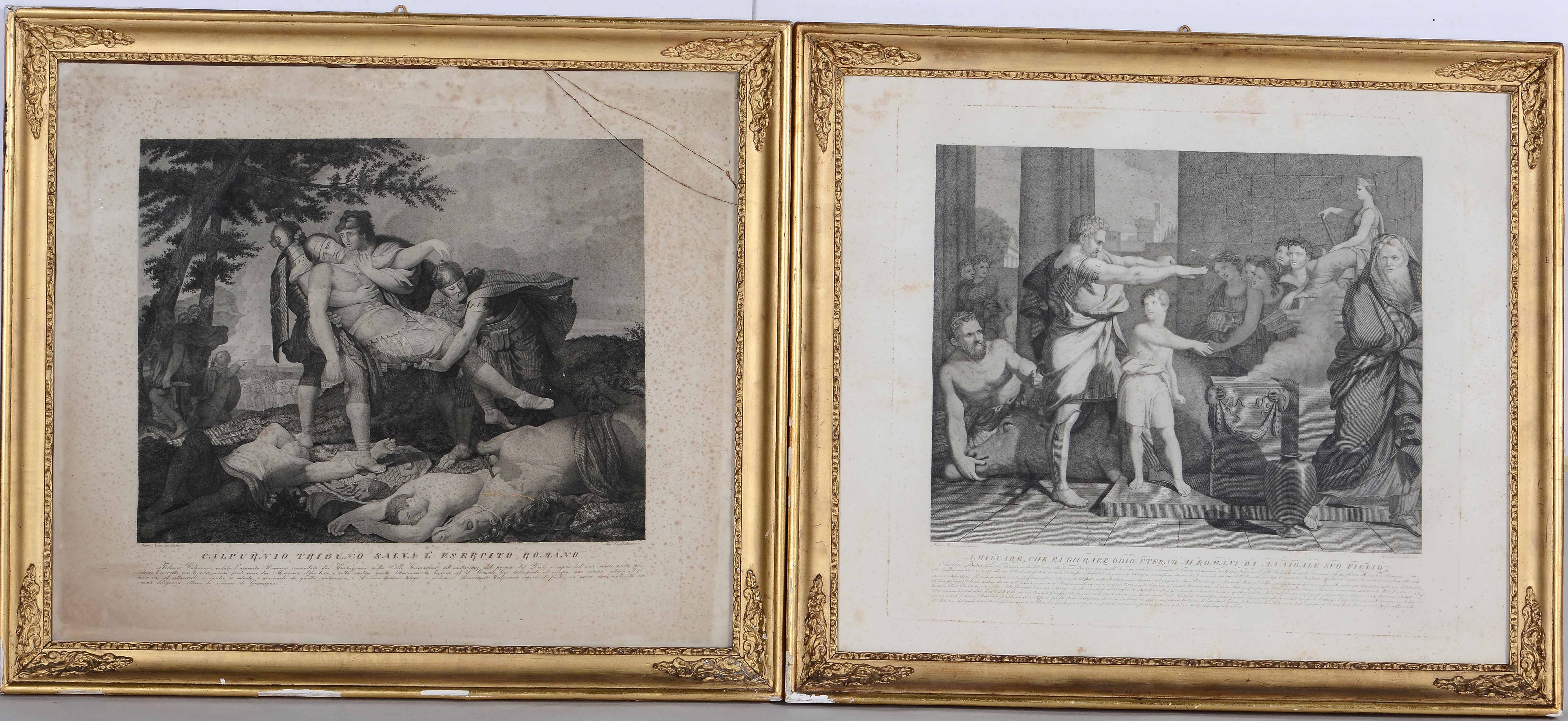 Coppia di stampe Calpurnio tribuno salva l'esercito romano e Amilcare che fa giurare [..]