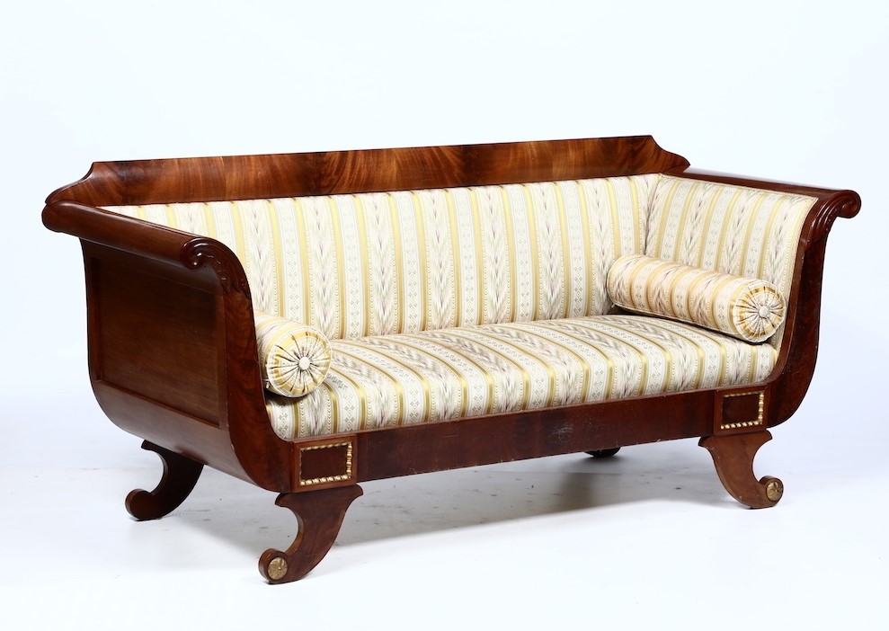 Divano Carlo X impiallacciato in mogano, XIX secolo