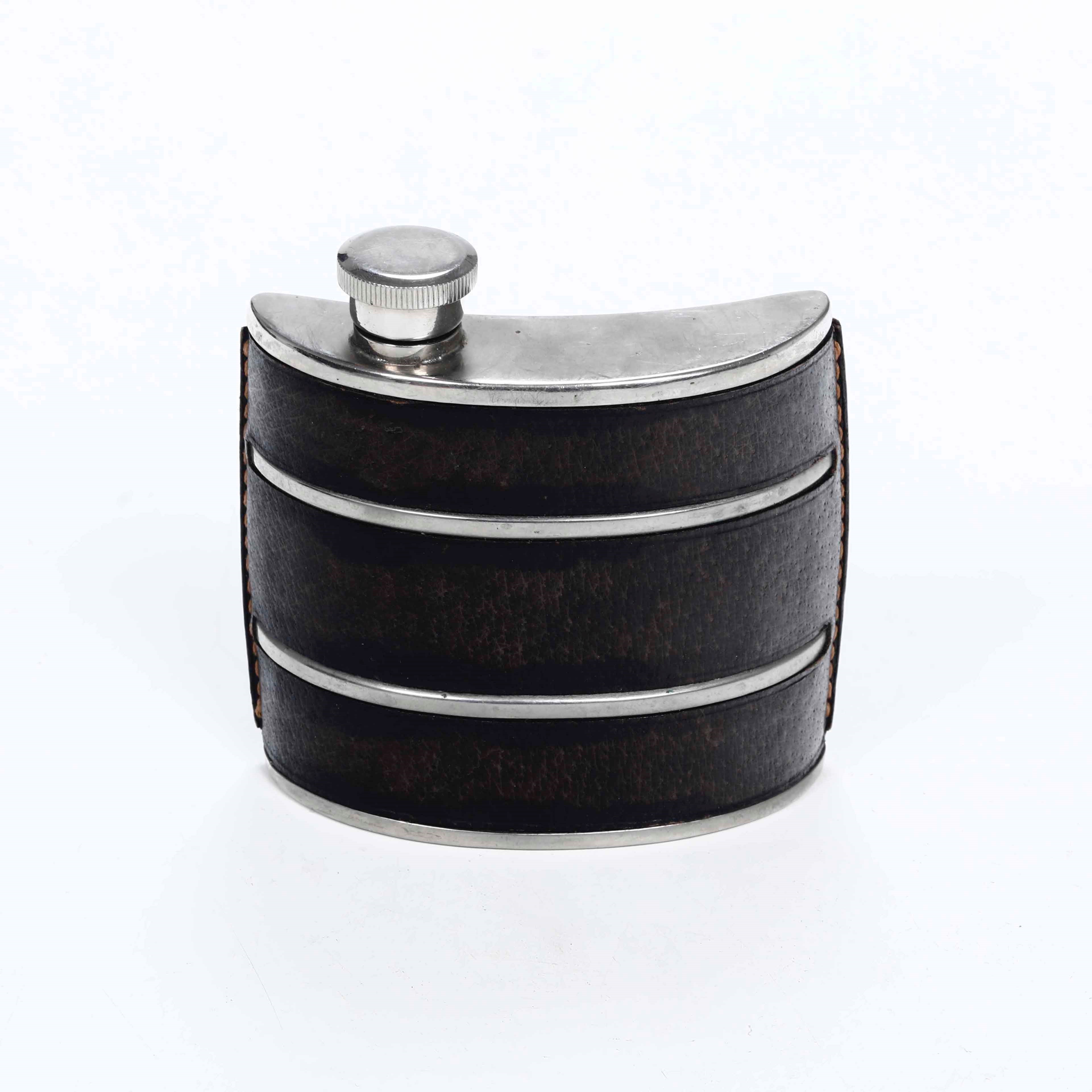Fiaschetta da tasca in metallo e cuoio. Gucci Vintage