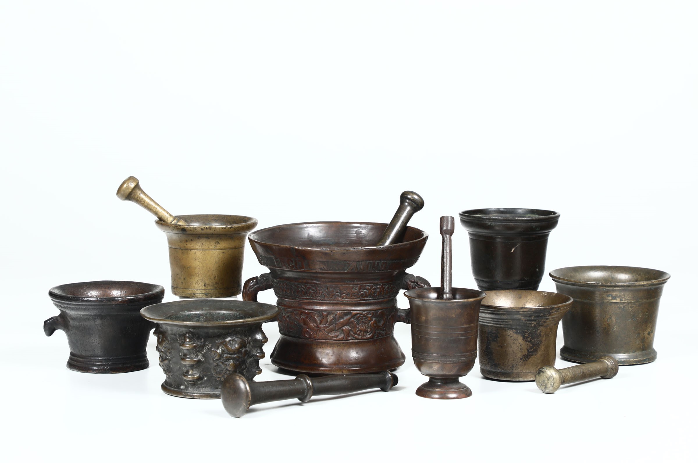 Gruppo di otto mortai in bronzo, varie epoche e manifatture