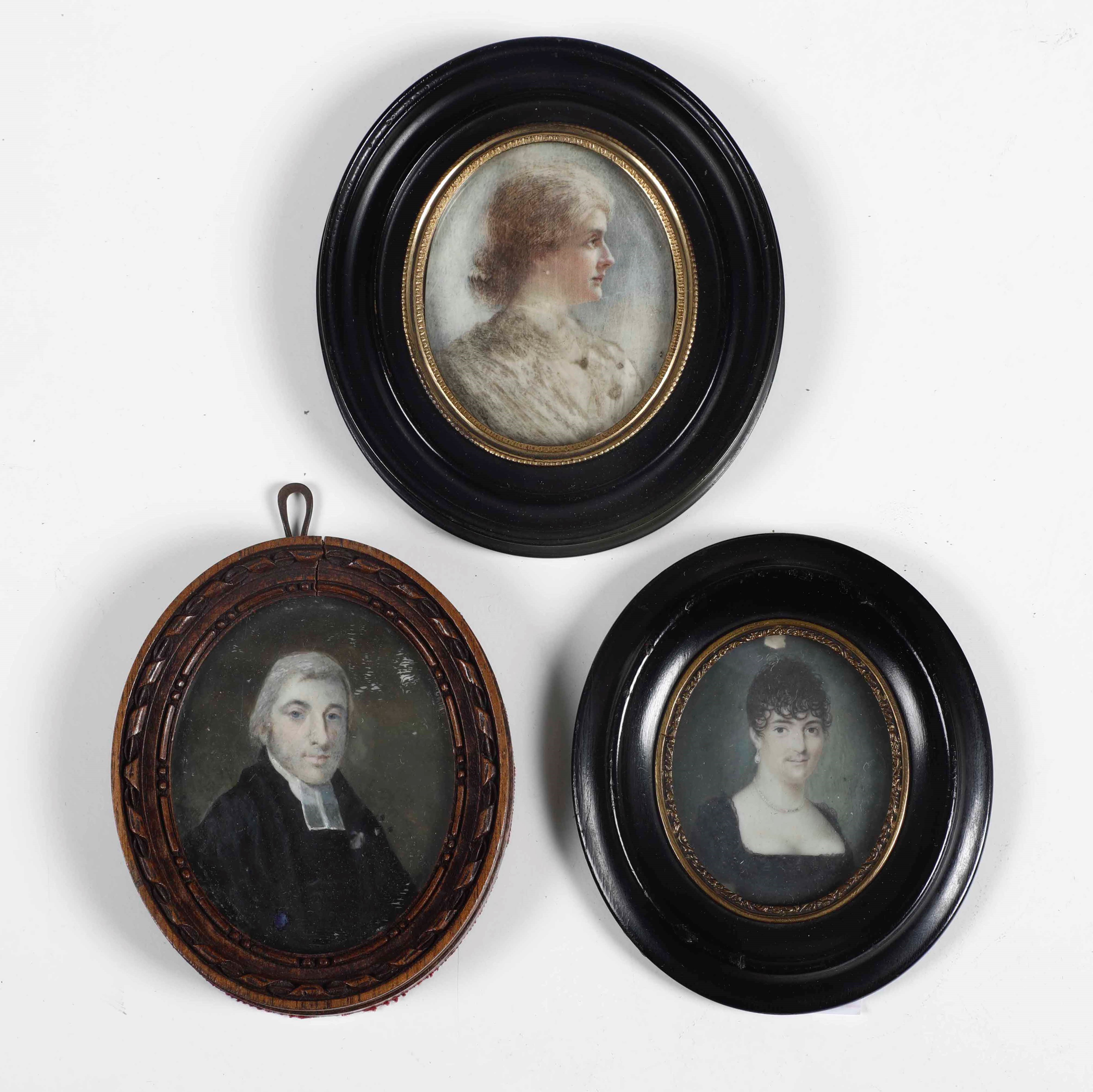Gruppo di tre miniature ovali raffiguranti due figure femminili e giovane religioso. [..]