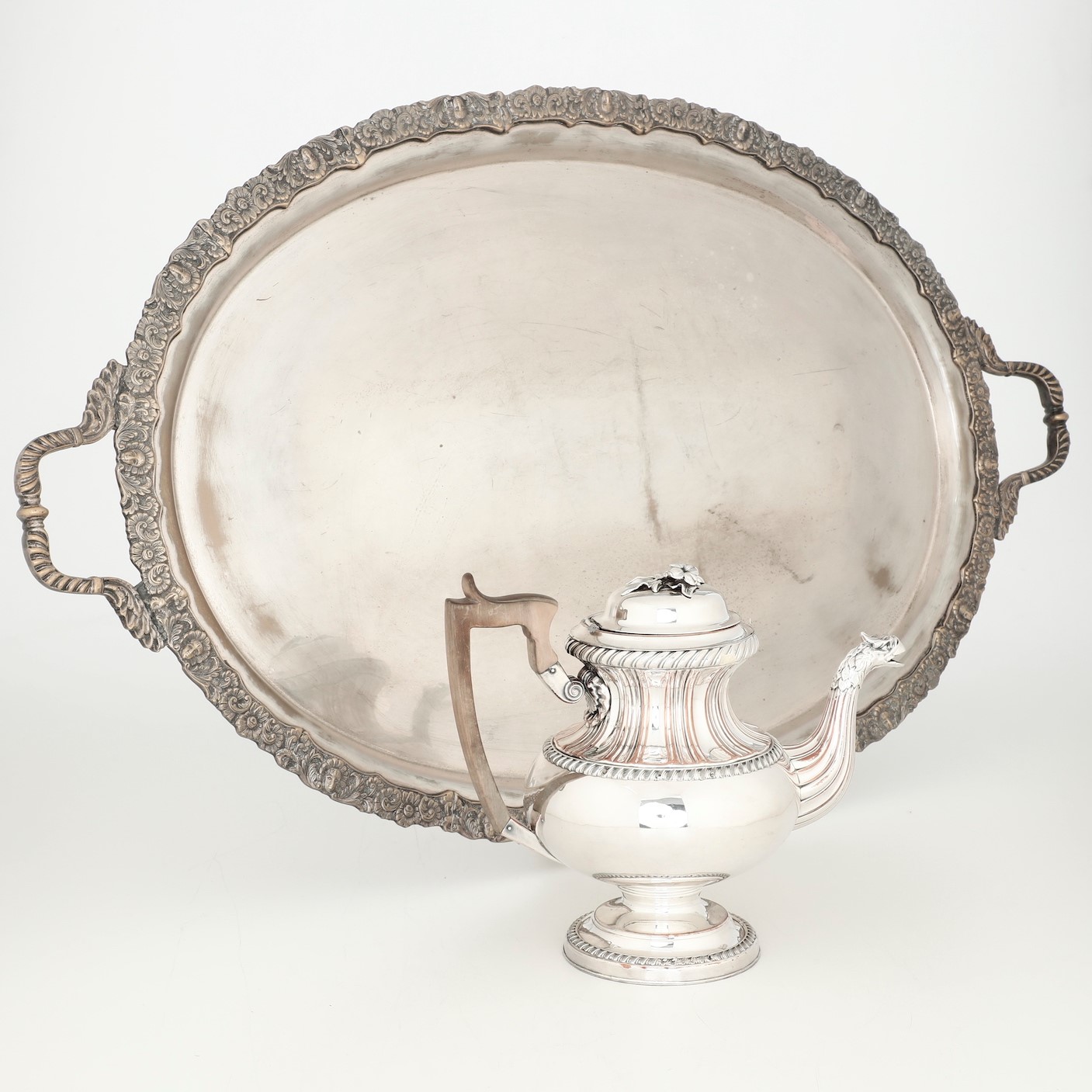 Vassoio e caffettiera in metallo argentato. XX secolo