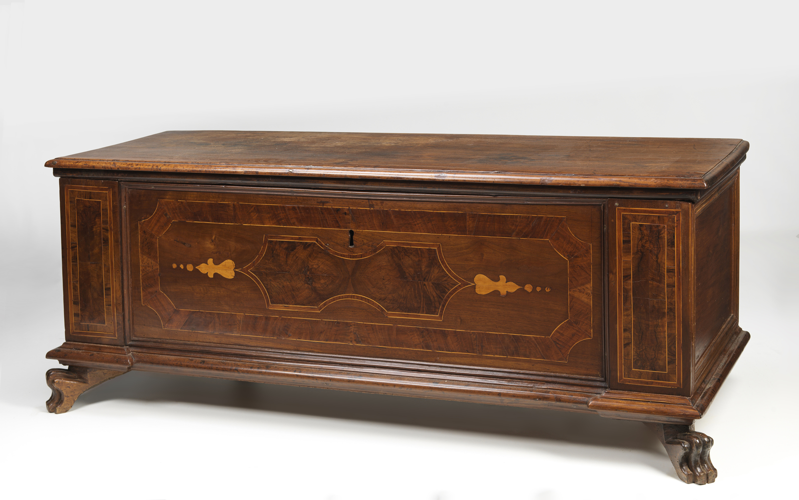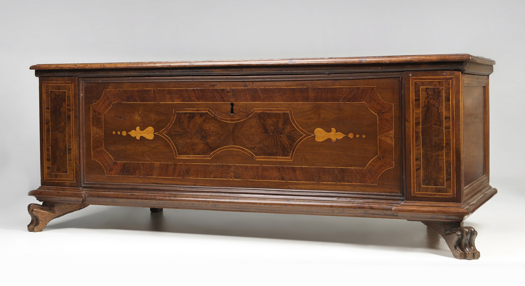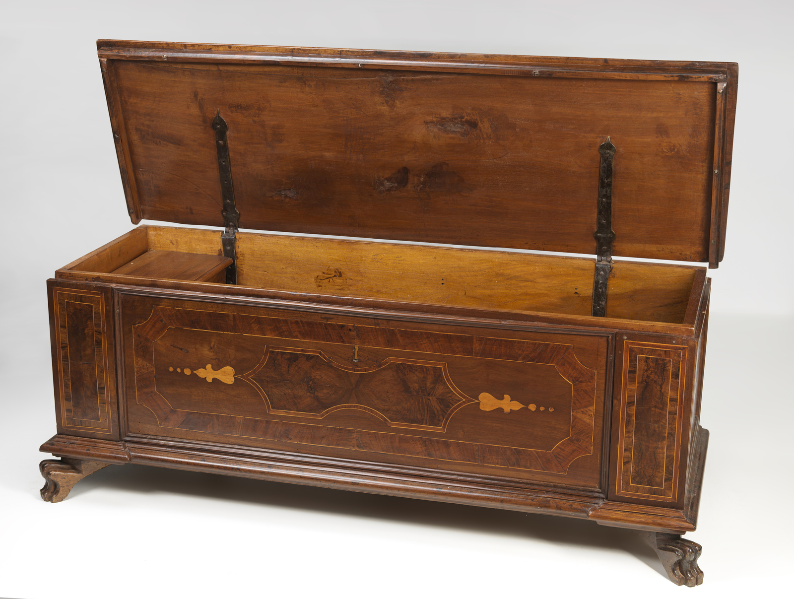 Cassapanca in legno intagliato e parzialmente lastronata in radica di noce, filettata [..]