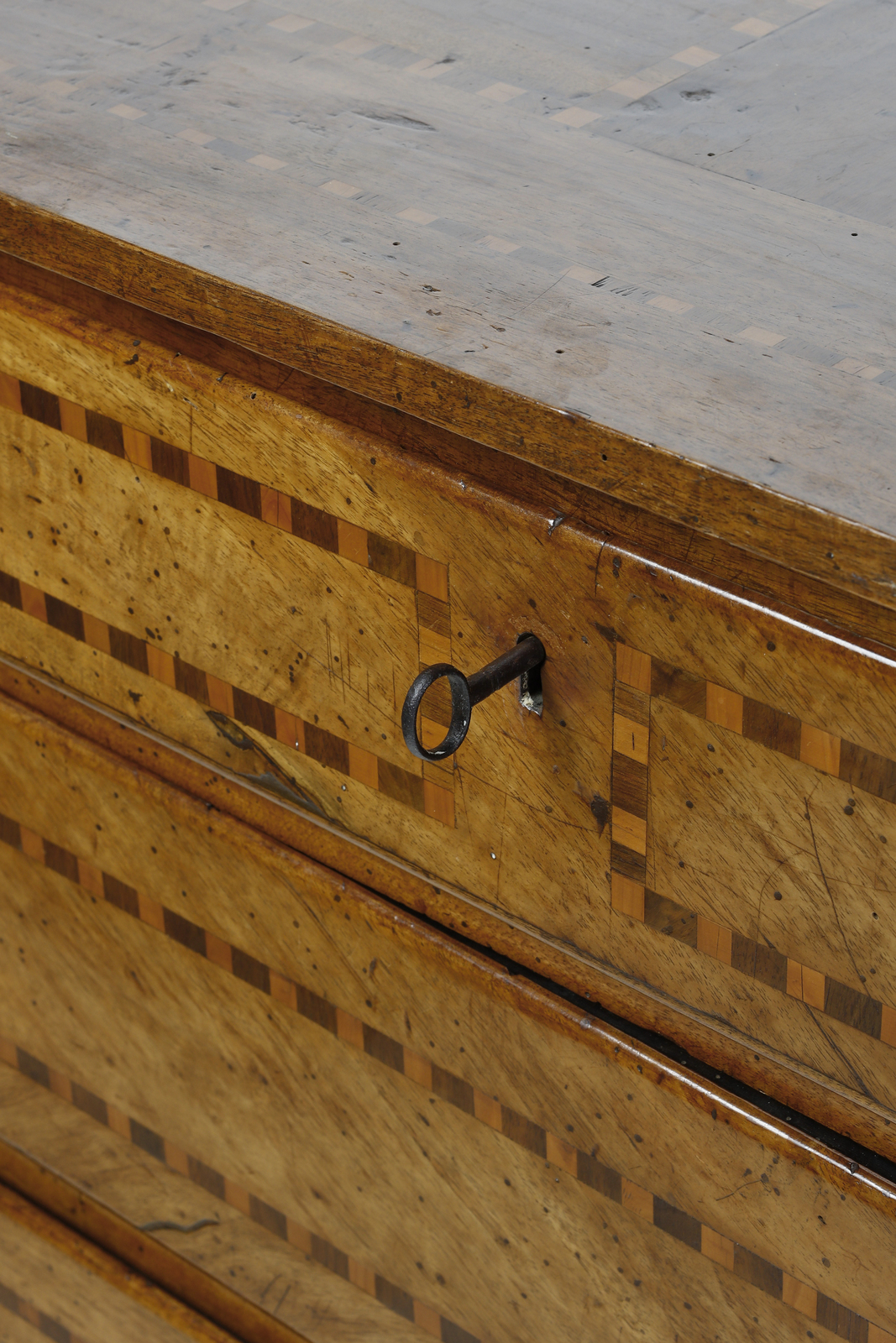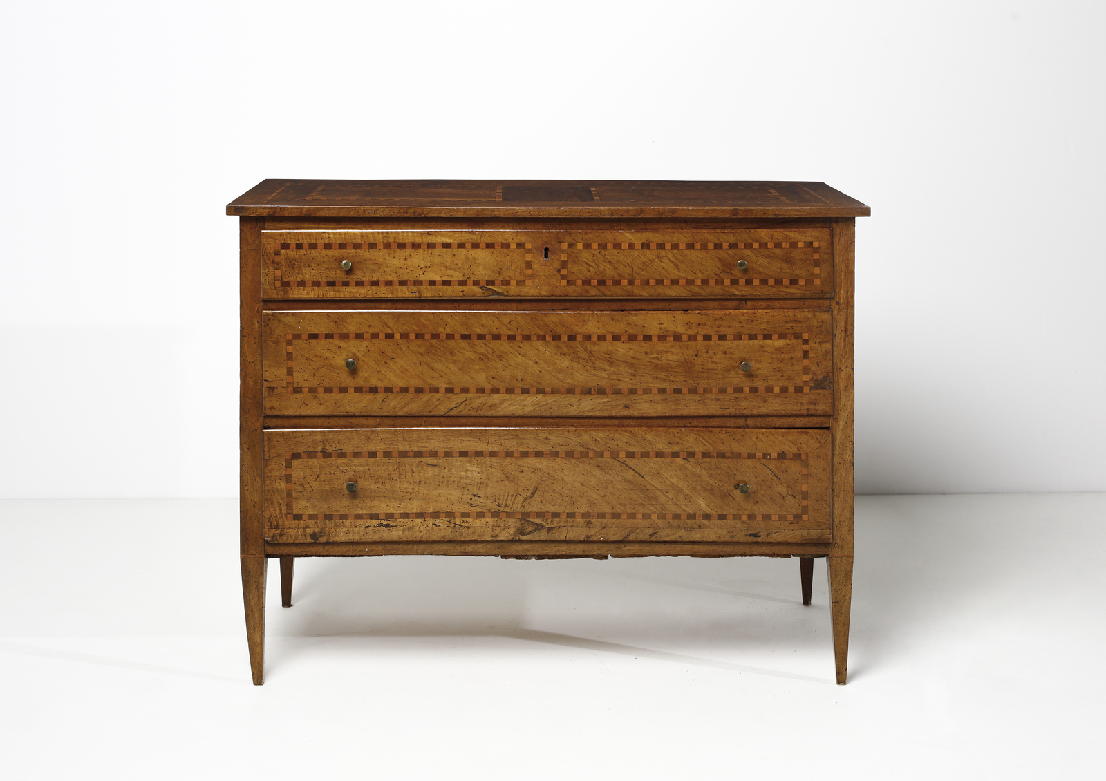 Cassettone lastronato in noce e radica di noce con intarsi a decorazioni geometriche, [..]