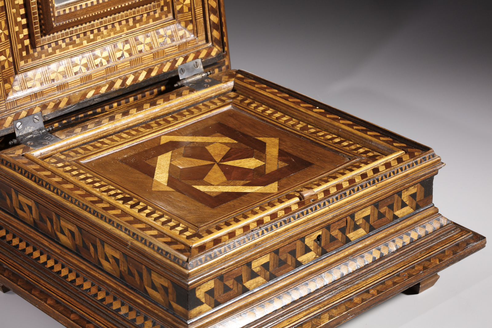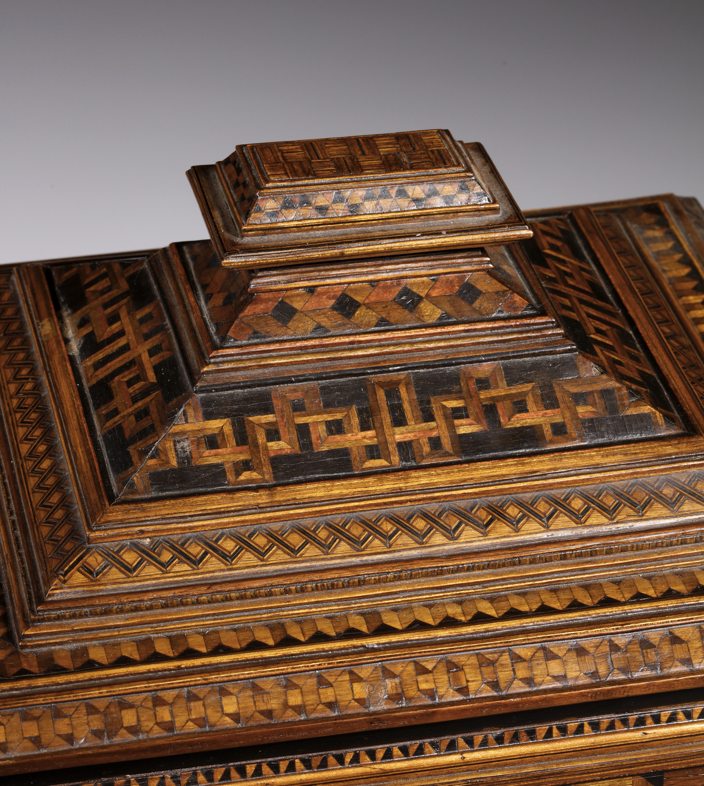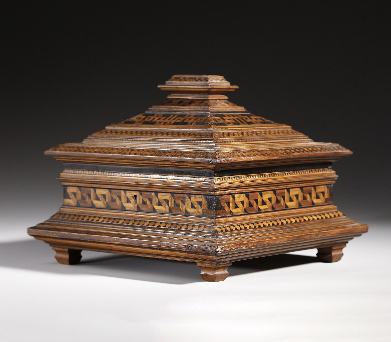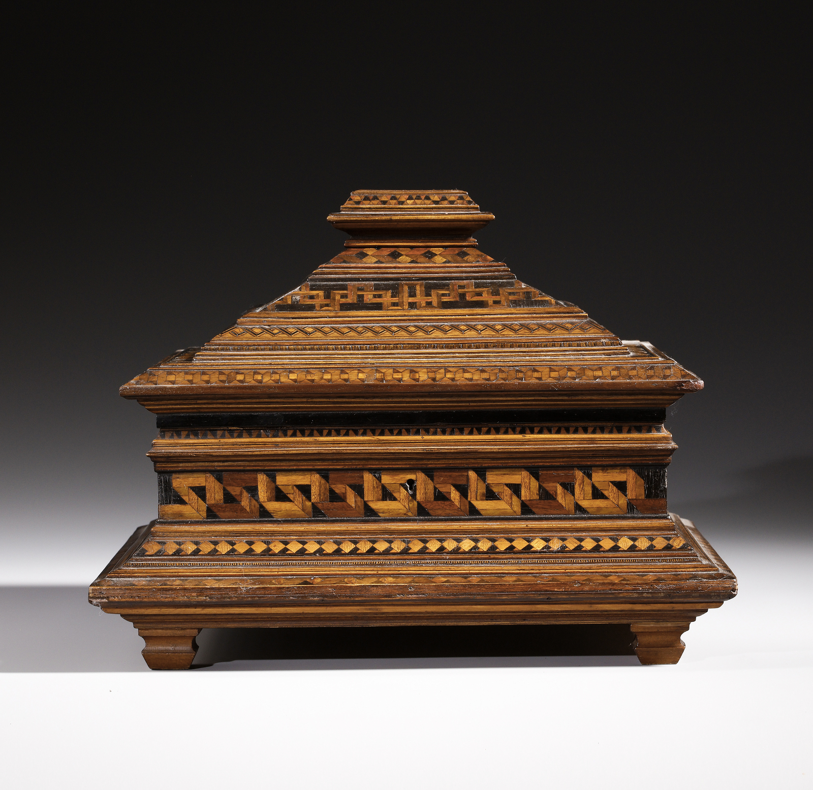 Cofanetto in legno scolpito e decorato con intarsi geometrici
