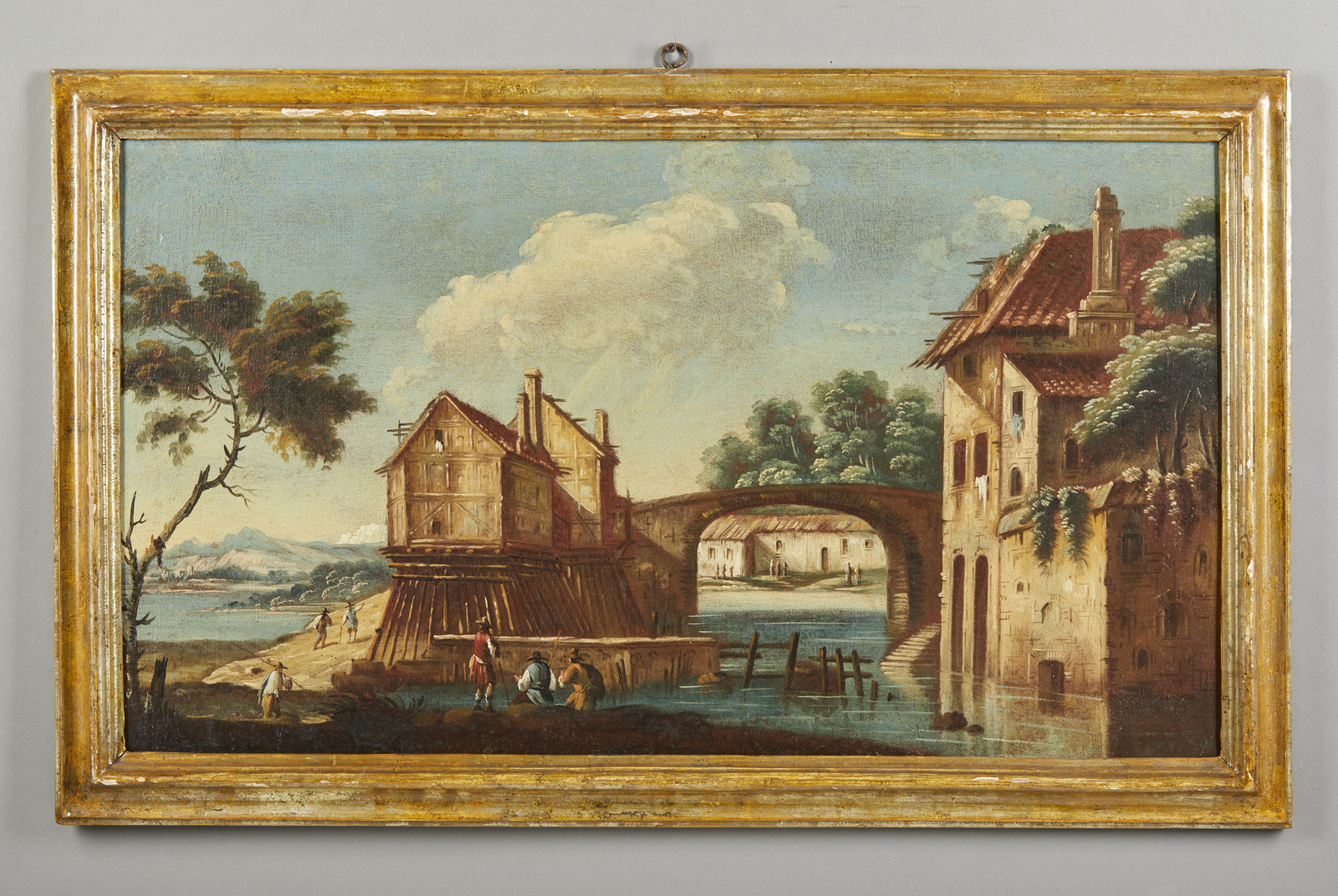 Coppia di dipinti raffiguranti paesaggio fluviale con personaggi