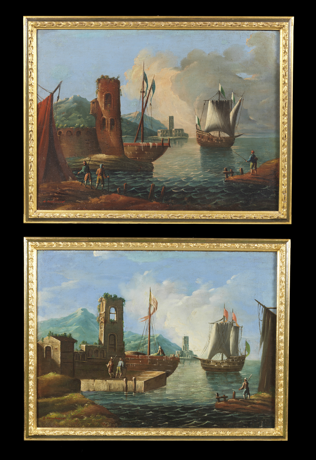 Coppia di dipinti raffiguranti porti con barche e personaggi