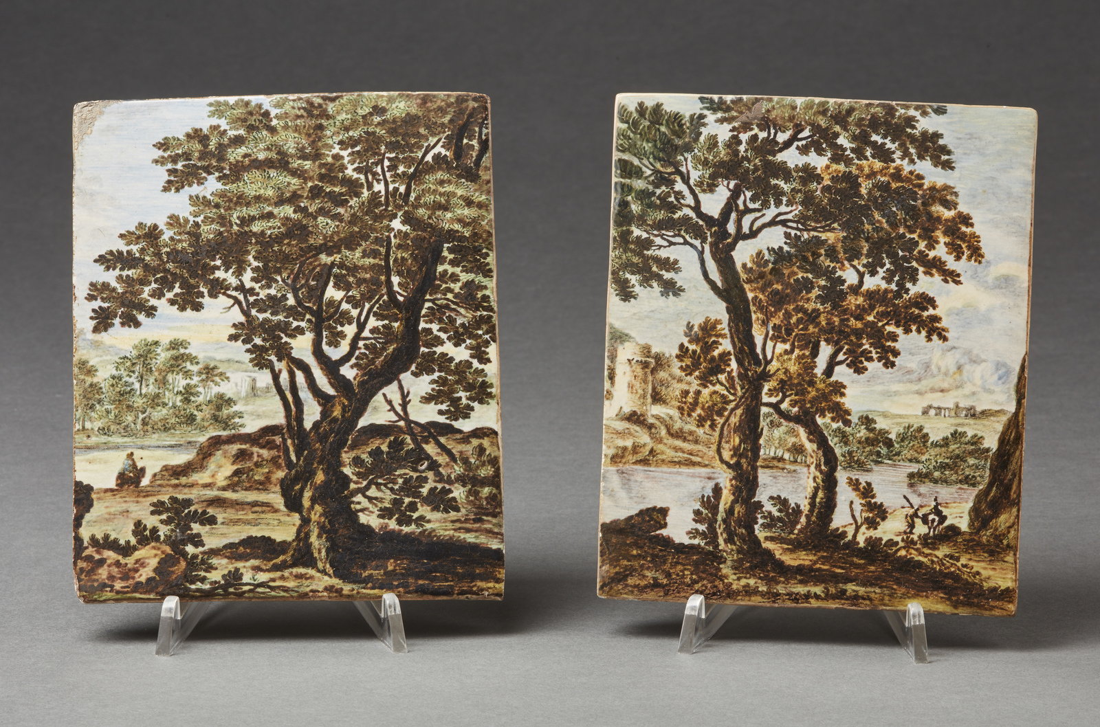 Coppia di placche in maiolica dipinte a policromia raffigurante paesaggi.