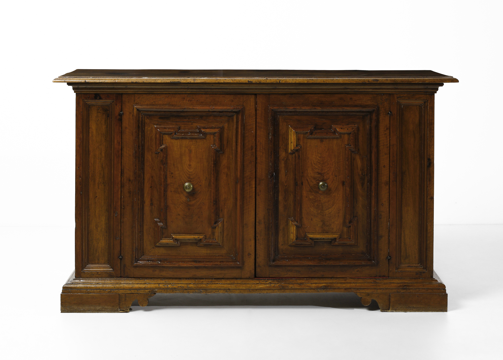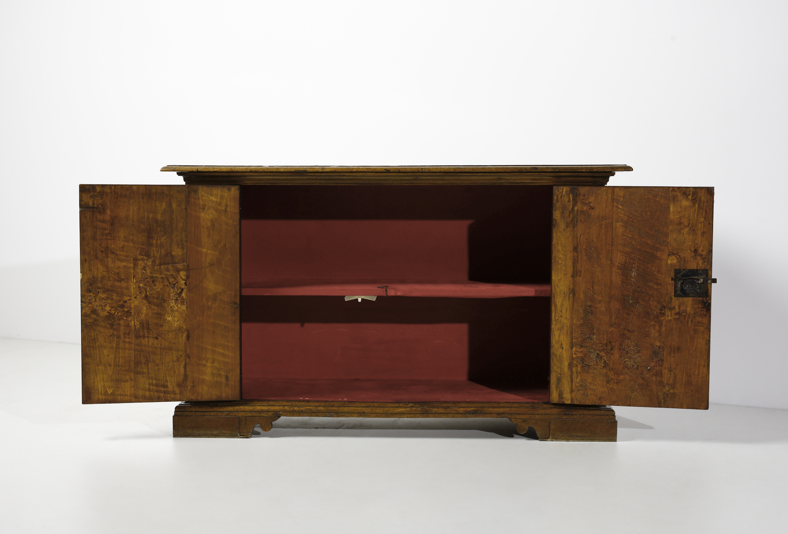 Credenza in legno di noce a due ante, fronte e fianchi pannellati e riquadrati, [..]