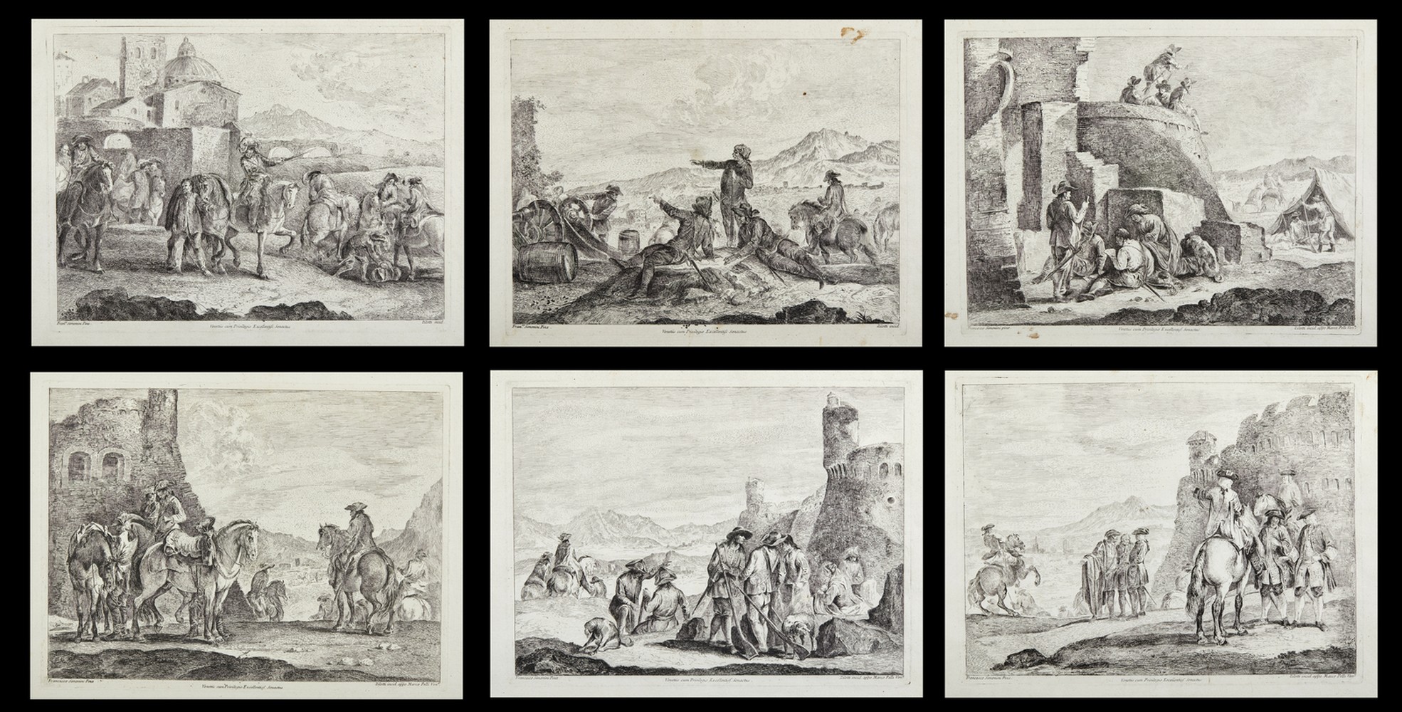 Gruppo di sei incisioni raffiguranti scene di battaglia