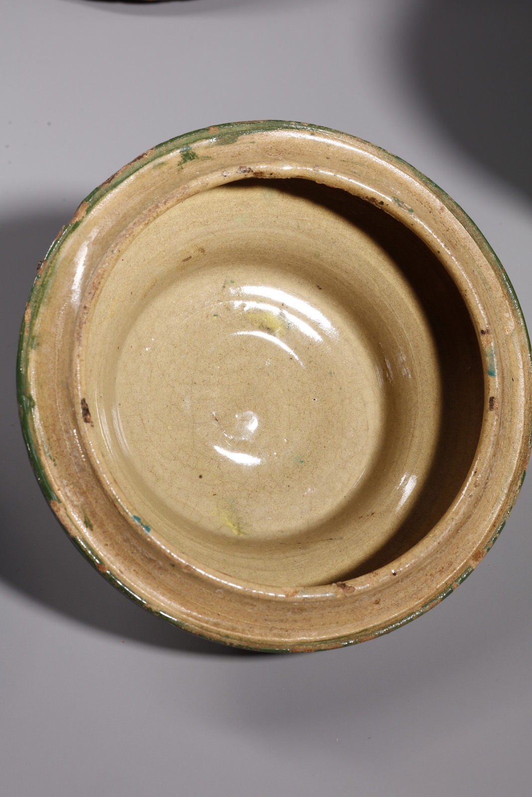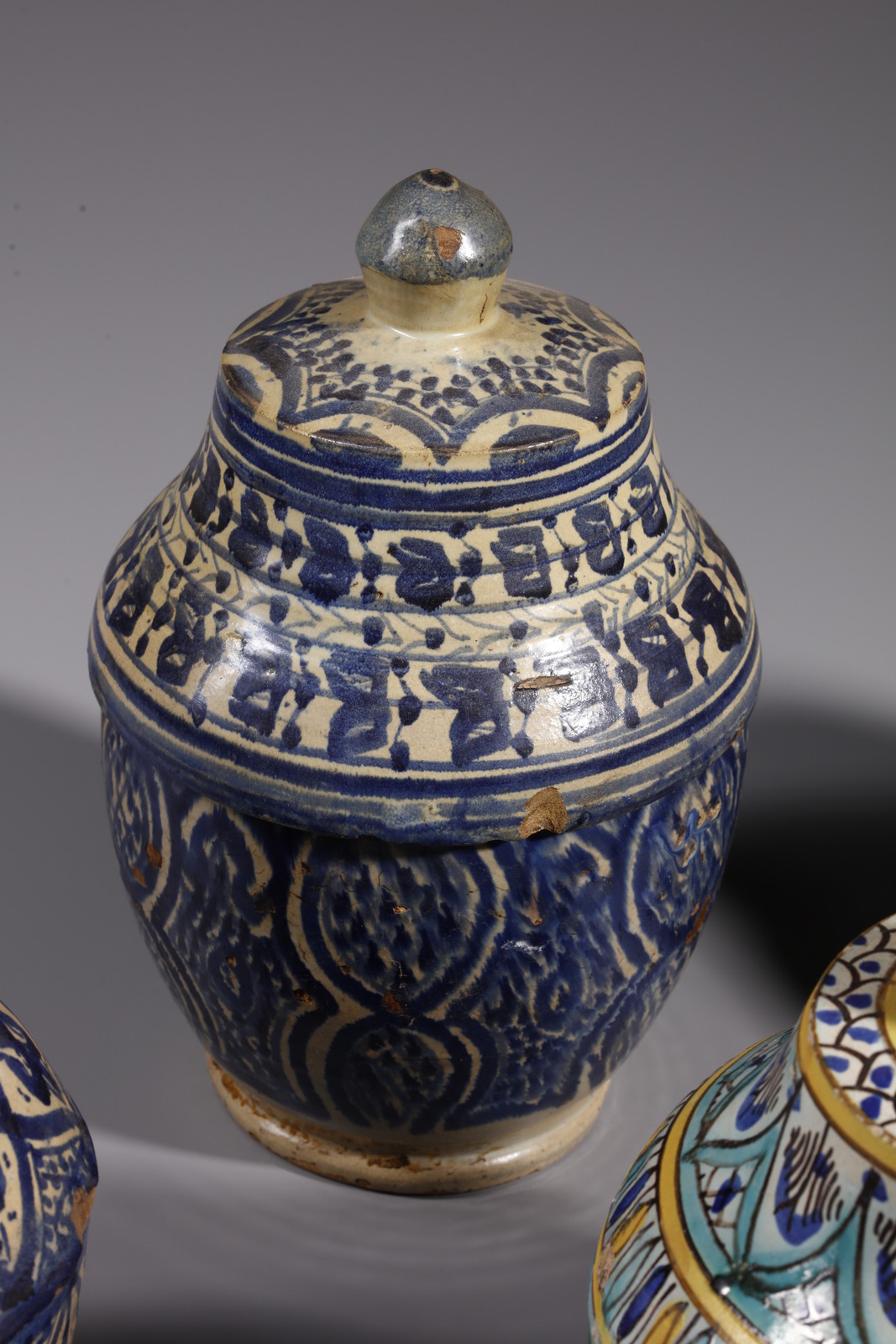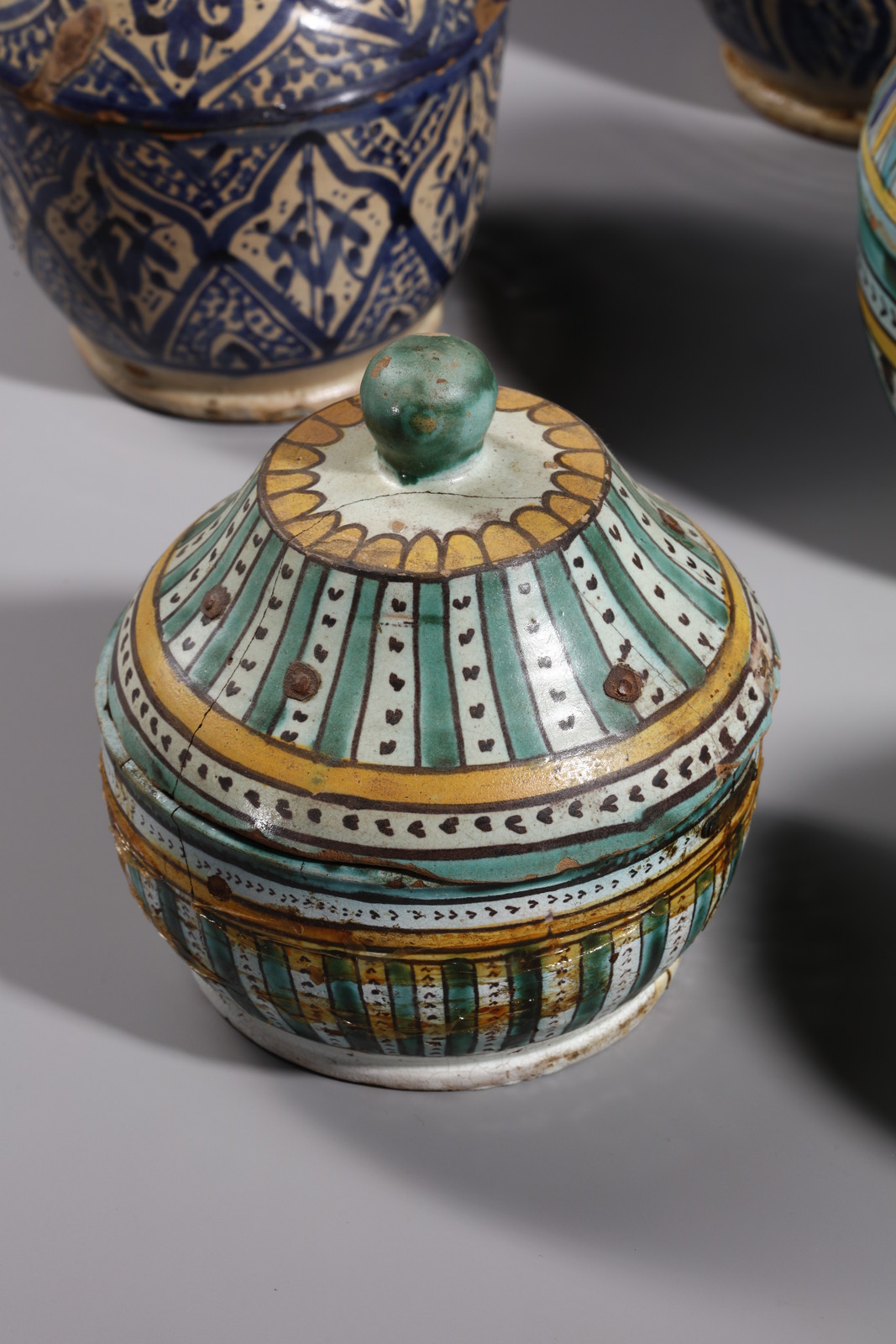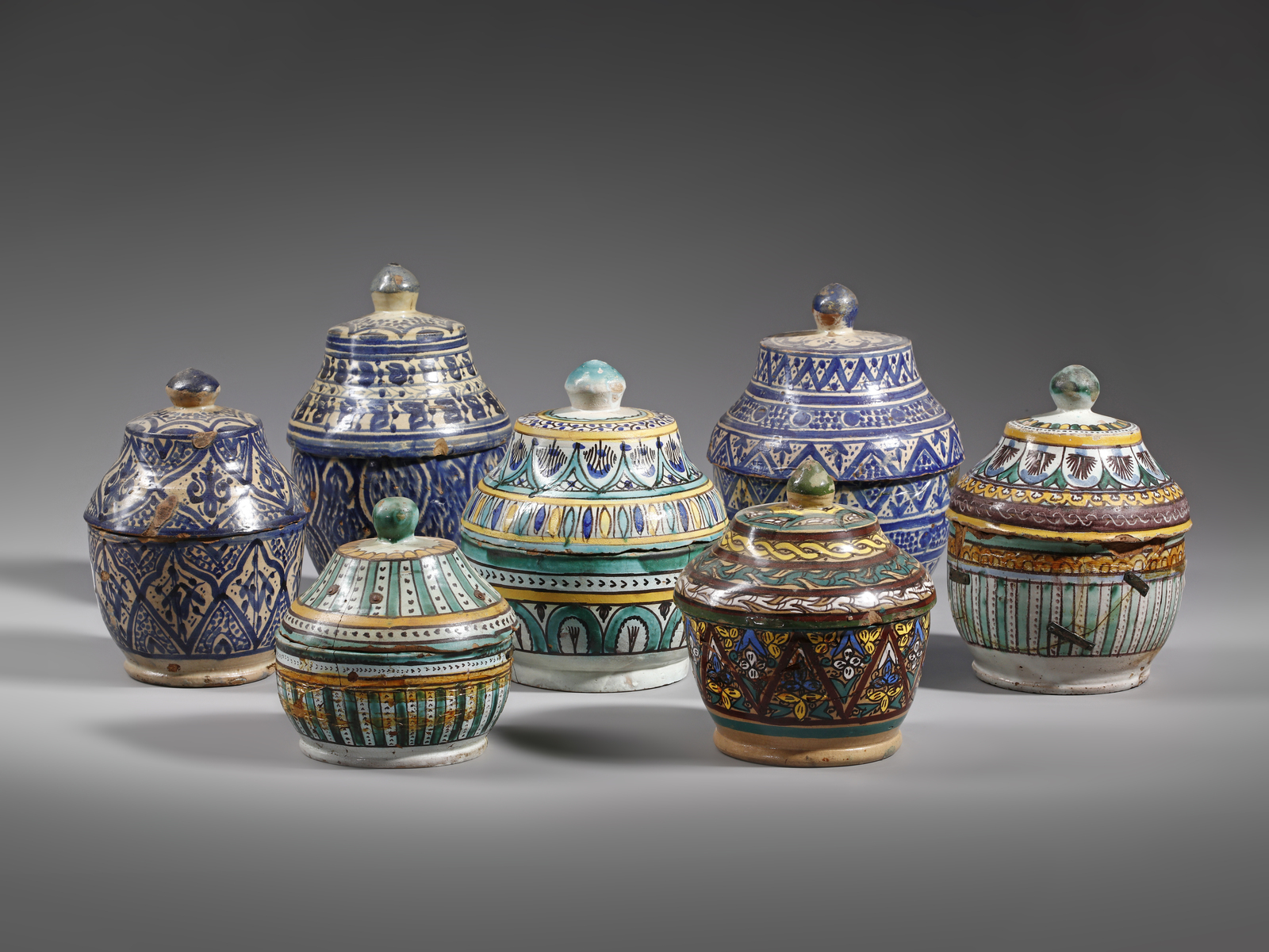 Gruppo di sette contenitori in maiolica policroma a decori geometrici