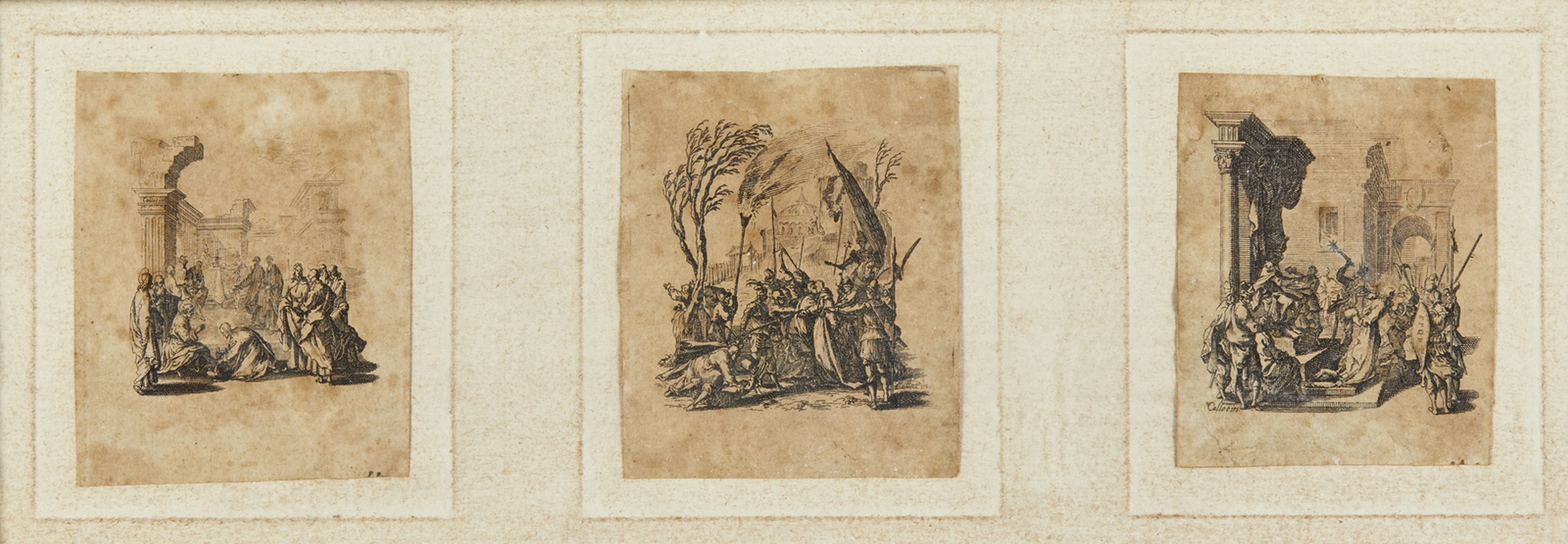 Gruppo di tre incisioni raffiguranti lavanda dei piedi, il bacio di Giuda, la condanna [..]