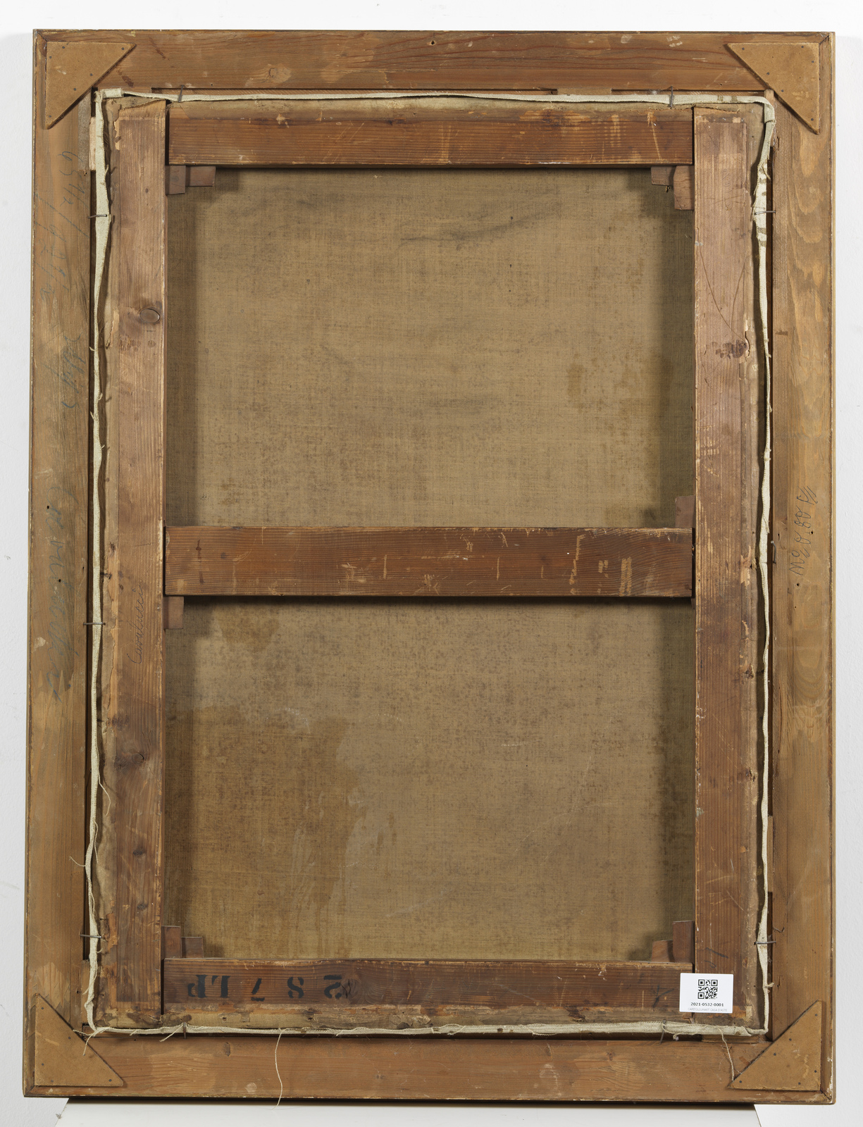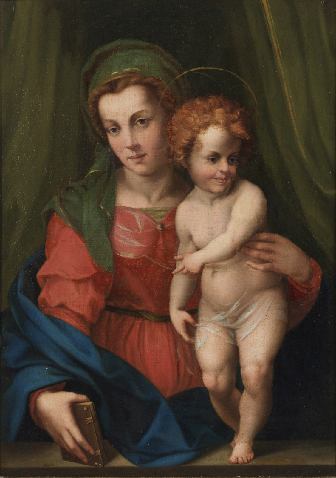 Firmato in basso a destraSi tratta di una copia eseguita dal pittore romano Antonio Cavallucci che la firma in basso a destra, di un dipinto di Andrea del Sarto, del secondo decennio del Cinquecento, di cui sono note due versioni, una alla National Gallery del Canada di Ottawa (cm 85x62), un’altra al National Museum of Western Art di Tokyo (cm 89x66), che l’ha recentemente comprata nel 2014. Giovanni Gherardo De Rossi nella Vita di Antonio Cavallucci da Sermoneta Pittore, edita a Venezia nel 1796 scrisse che l’artista romano: “ebbe in mira la semplicità di Fra Bartolomeo e volle imitare nel panneggio lo stile di Andrea del Sarto” (p. 30). Il Cavallucci infatti aveva ammirato le opere dei pittori toscani del primo Cinquecento, come pure quelle di Tiziano e di Coreggio, durante il viaggio in alta Italia, compiuto in compagnia del cardinale Romualdo Braschi nel 1787 durante il quale in due soli mesi visitò Venezia, Firenze, Bologna e Parma (S. Roettgen, Antonio Cavallucci e la sua pittura religiosa. Un pictor cristianus nella Roma di Pio VI, in Palazzi, chiese, arredi e scultura, Roma 2011, p. 260). Cavallucci doveva essere solito copiare dipinti dei pittori amati durante questo viaggio, considerato che si conosce una sua copia del correggesco Matrimonio mistico di santa Caterina e una della Carità di Luca Cambiaso (entrambe National Trust, UK).