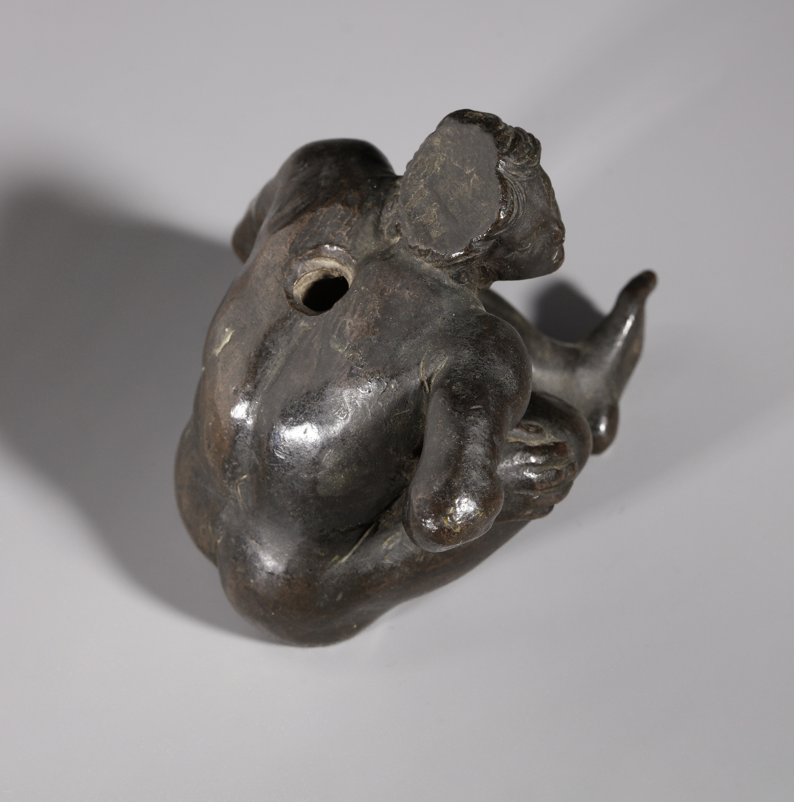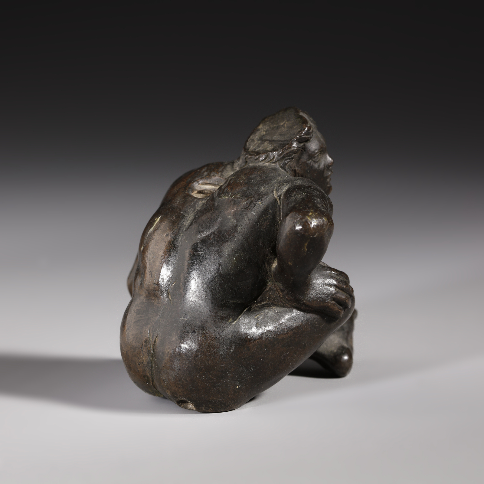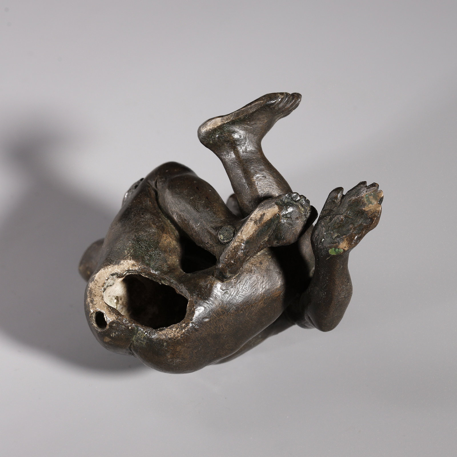 Si può supporre che questa figura, in origine, facesse parte di un calamaio o di una struttura tripode in bronzo poggiante su supporti in forma umana.