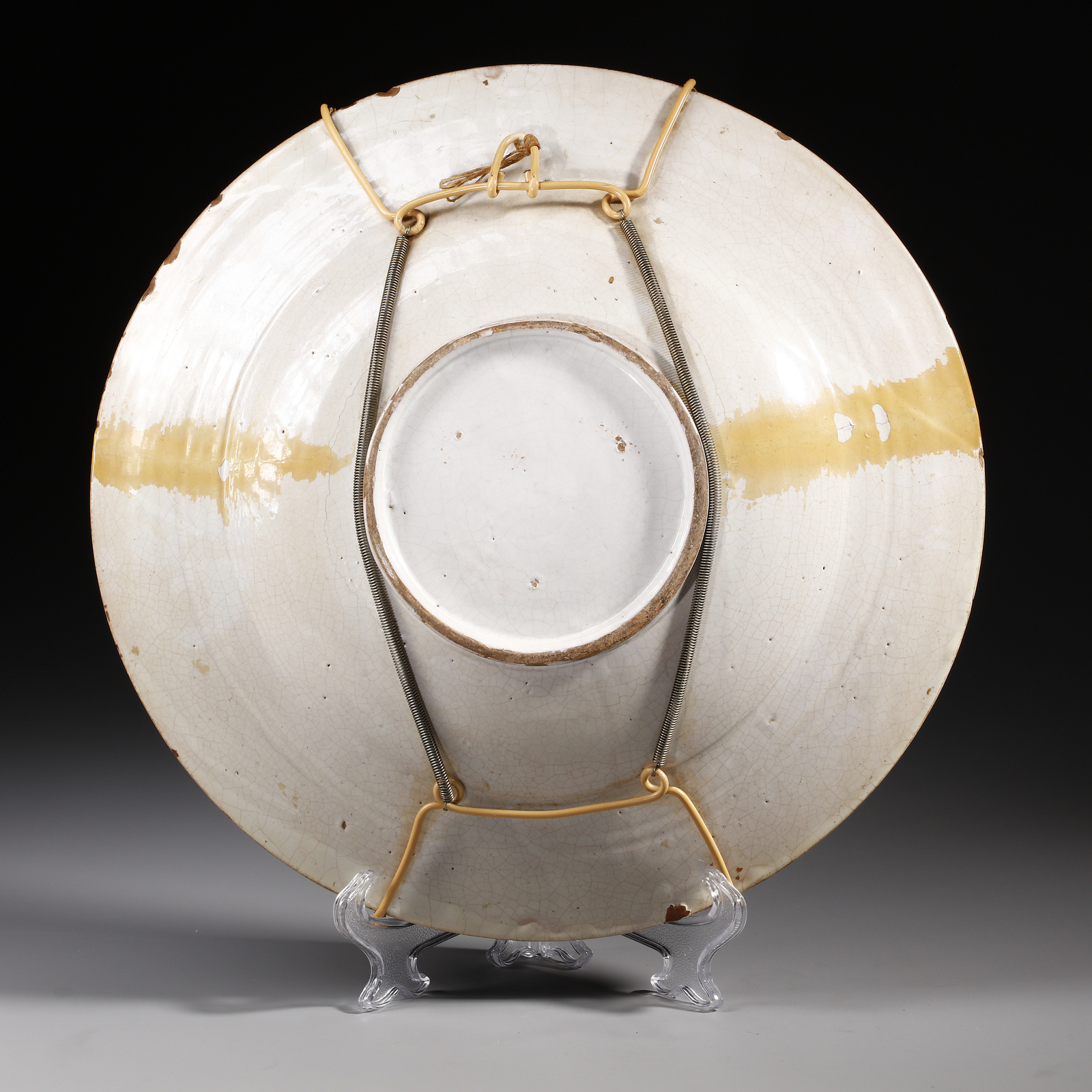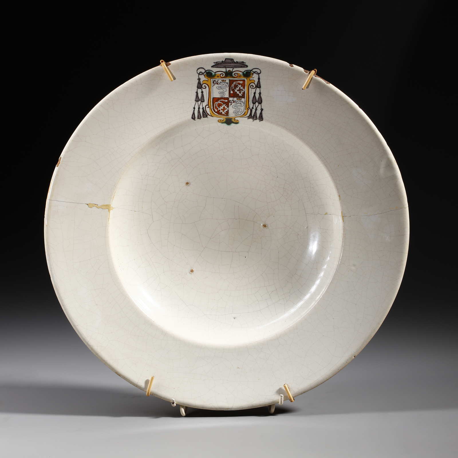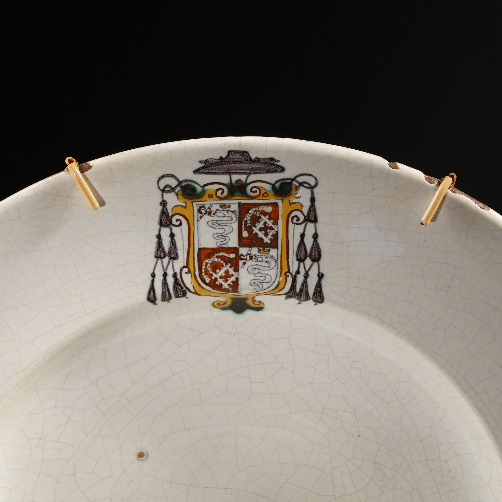 Piatto da parata in maiolica bianca decorato con stemma cardinalizio