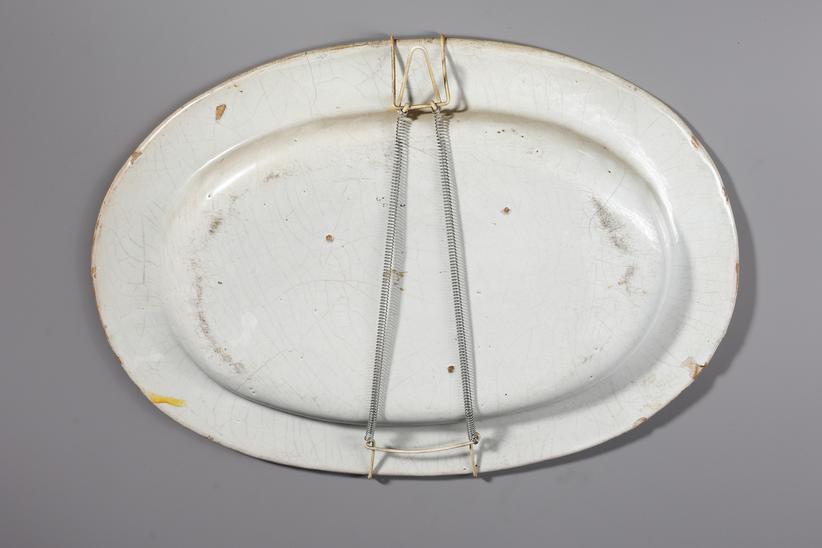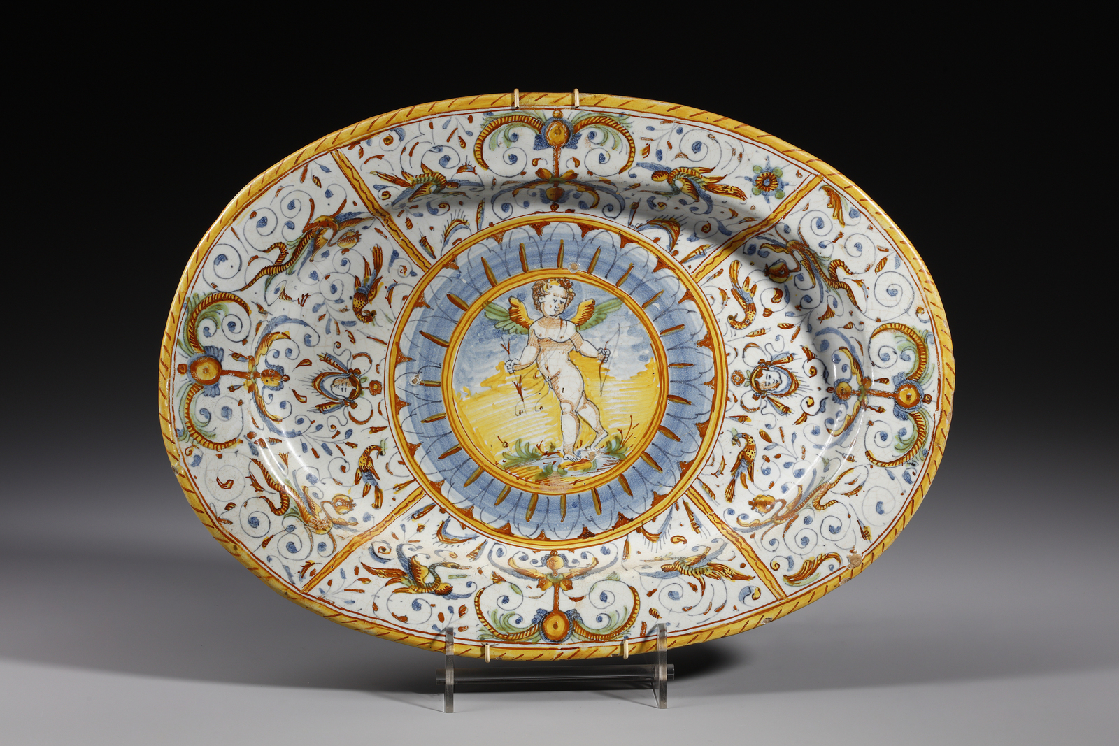 Piatto ovale in maiolica policroma decorato con putto alato armato di arco entro [..]
