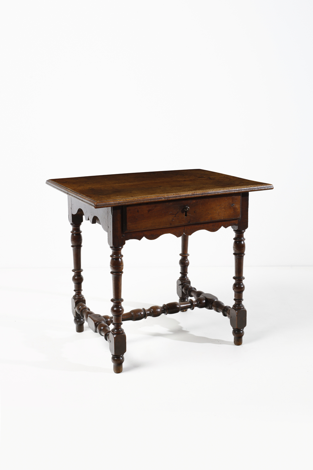 Piccolo tavolino in noce, gambe e traversa a rocchetto