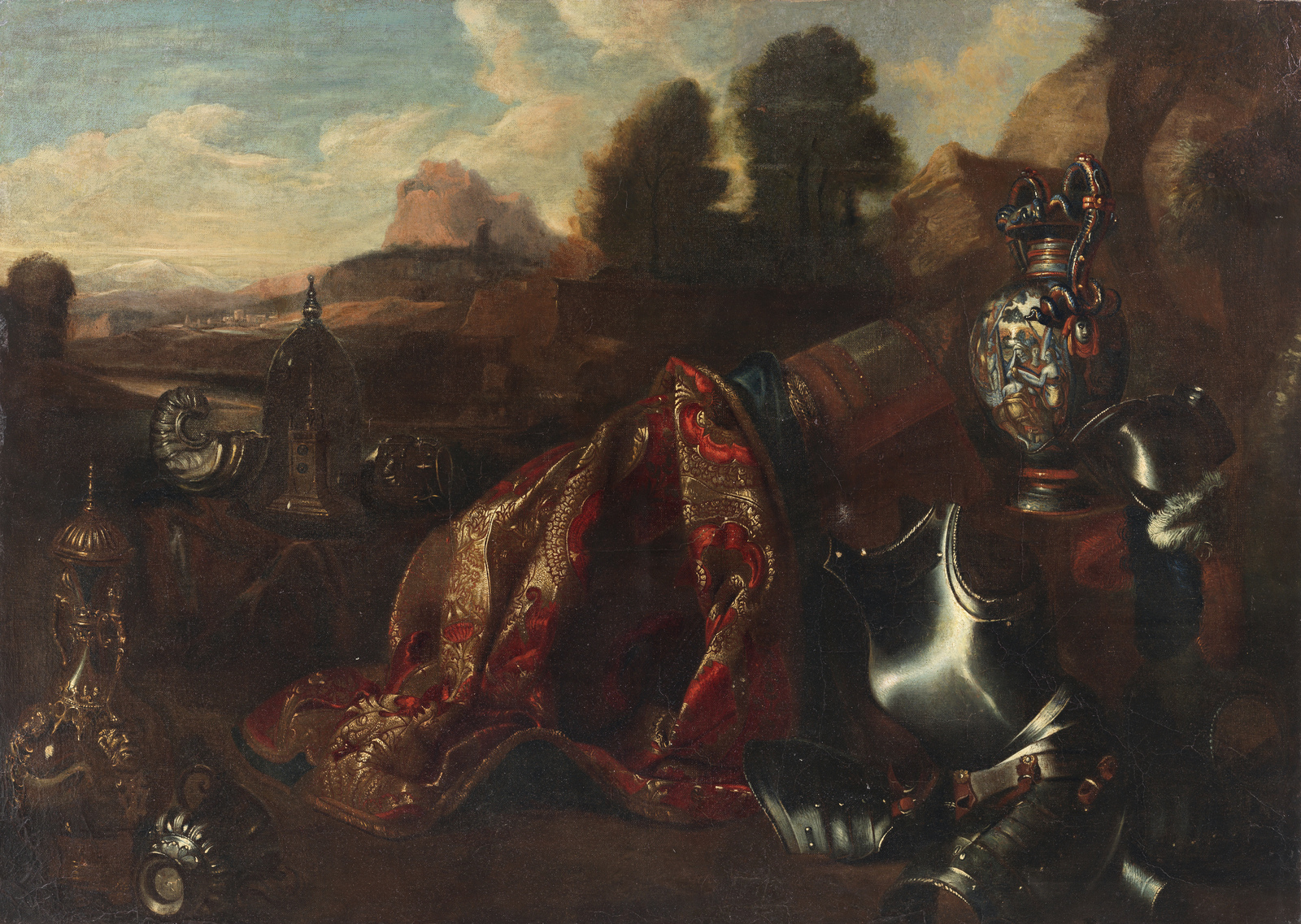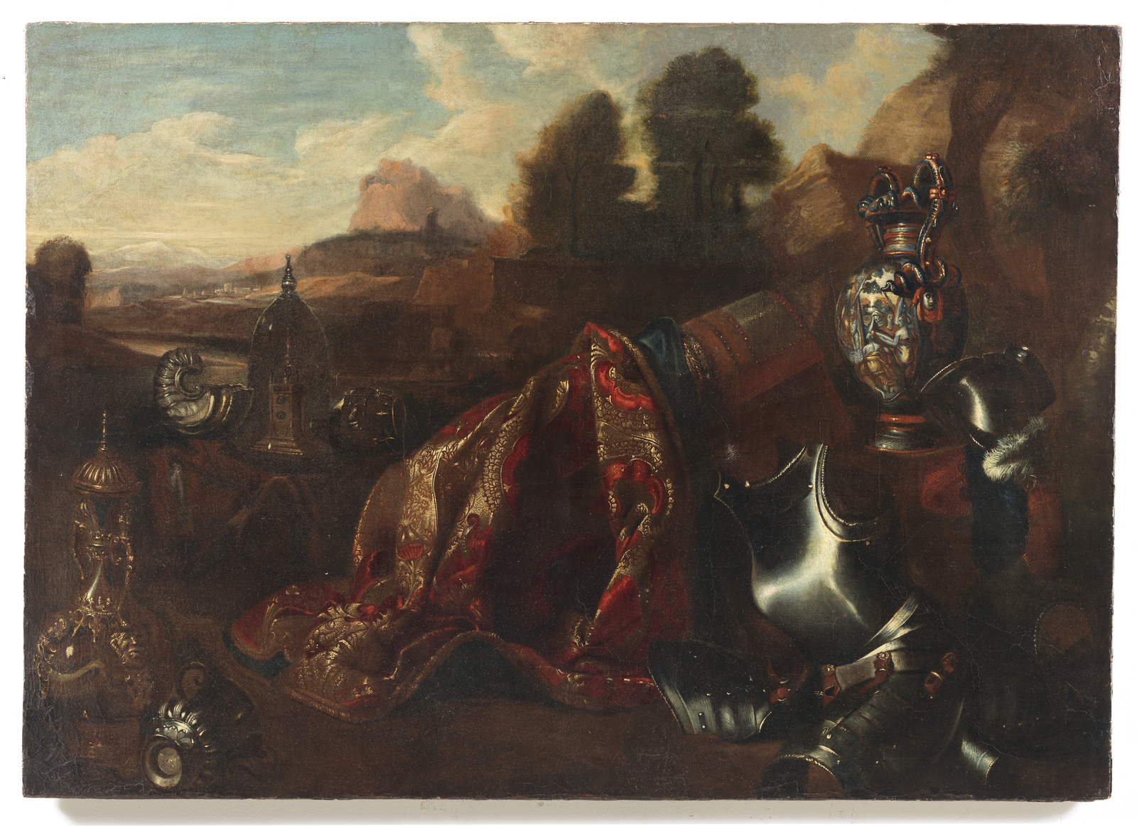 L'opera è accompagnata dalla scheda a cura di Alberto Cottino, Torino, 5 marzo 2022Questo bellissimo dipinto, tradizionalmente attribuito al Grechetto, presenta una serie di oggetti, forse un bottino di guerra o un'allegoria della vanità, poggiati a terra in una radura ai piedi di una montagna rocciosa, con un fiume e alcuni alberi in lontananza. Il tema è curioso e raro, vagamente metafisico, elegante e misterioso così come, al momento, ancora misterioso è il nome del suo autore. Il variopinto vaso istoriato sulla destra con mascherone sotto il manico riconduce inequivocabilmente ad un altro quadro conservato presso la Galleria Colonna a Roma e menzionato in un inventario del 1679. In quell'occasione il quadro veniva descritto come opera di un non meglio identificato ''Rosso Genovese'', mentre a partire dal 1714, poi in successivi inventari Colonna e fino a tempi recenti è stato ascritto proprio al Grechetto o al massimo alla maniera sua, come risulta in un inventario del 1783.Alcuni degli elementi di quest'opera compaiono in altre tele. Si trattava evidentemente di un pittore che amava riproporre i medesimi manufatti, magari combinati diversamente, in modo da creare dipinti diversi ma tutti legati tra loro da una medesima struttura compositiva, che ai nostri occhi li rende immediatamente riconoscibili.