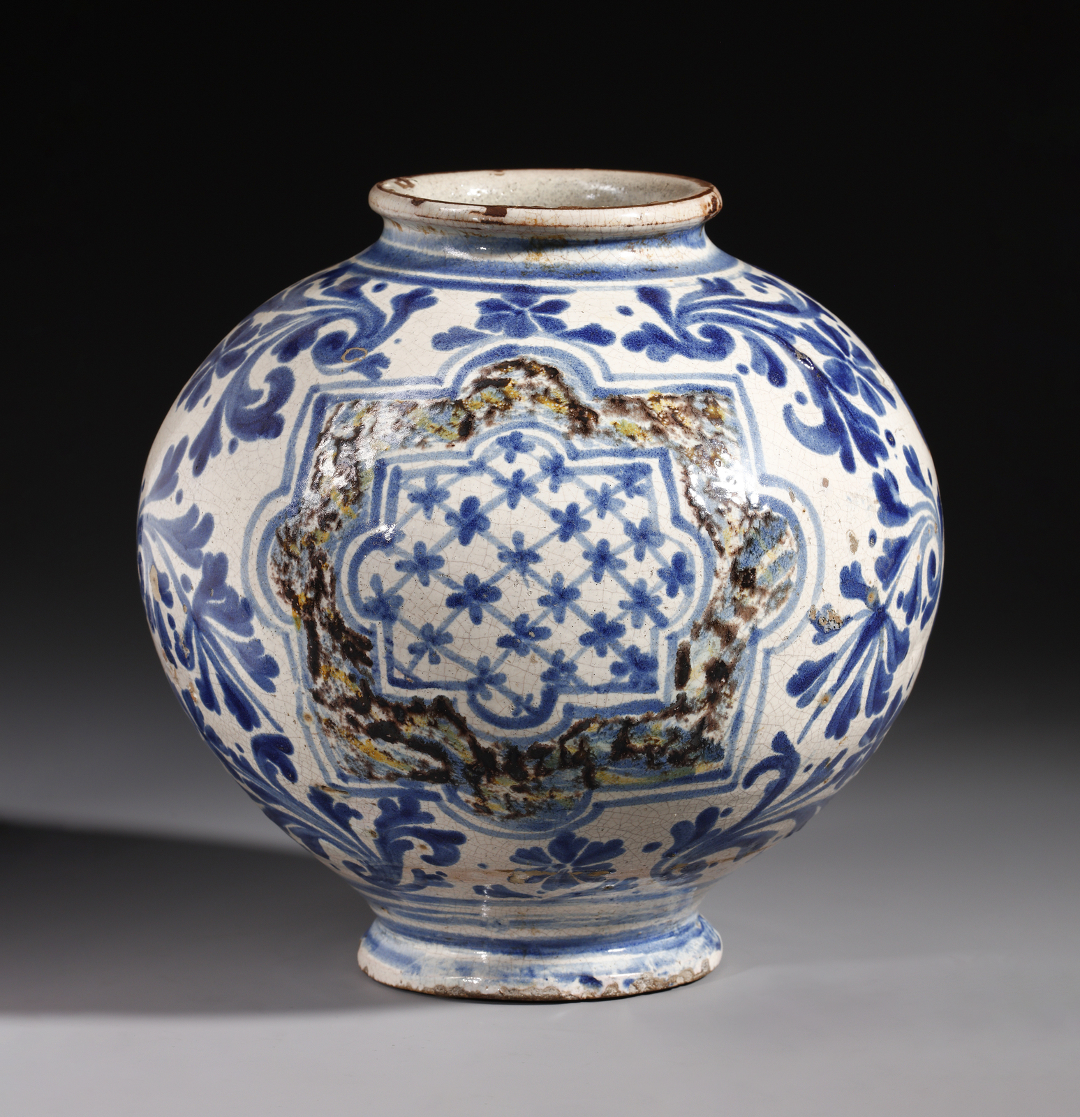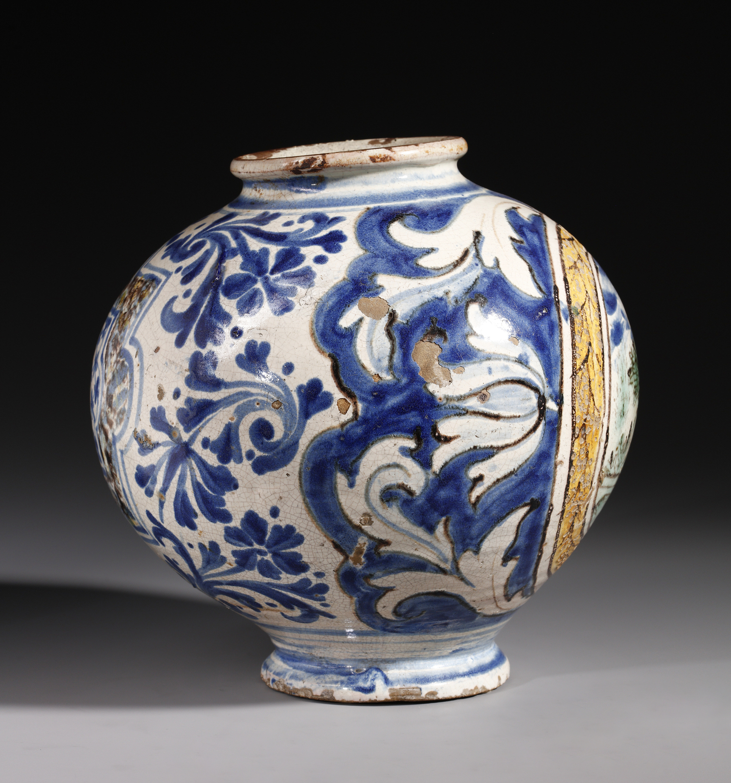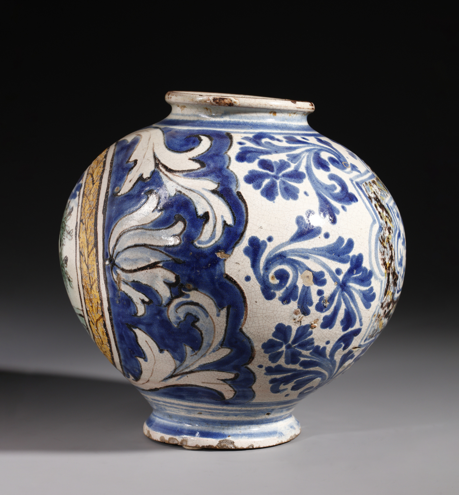 Vaso globulare in maiolica policroma con decoro a girali e paesaggio stilizzato [..]
