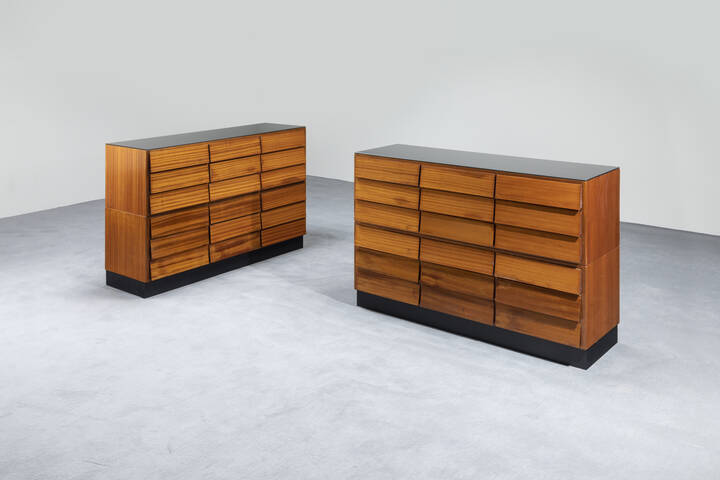 Coppia di cassettiere in legno impiallacciato con cassettiere estraibili. Anni '50 [..]