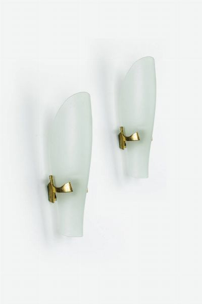 Coppia di lampade a muro con supporti in ottone diffusori in vetro smerigliato. [..]