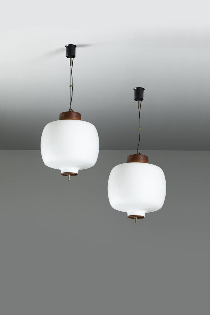 Coppia di lampade a sospensione in vetro opalino legno e metallo verniciato. Anni [..]