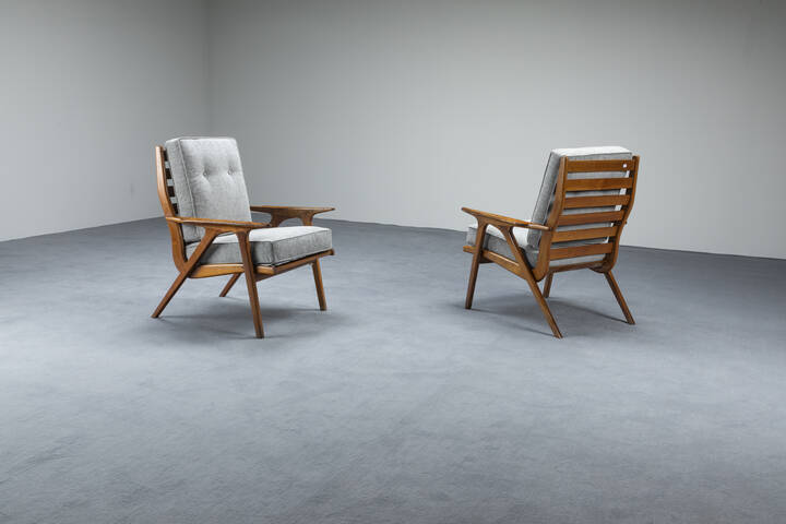 Coppia di poltroncine con struttura in legno schienali a doghe cuscini imbottiti rivestiti in tessuto. Anni '50 cm 87x67x70