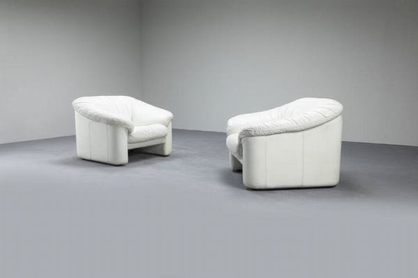 Coppia di poltrone con struttura in legno e rivestimenti in pelle. Anni '70 cm 7 [..]