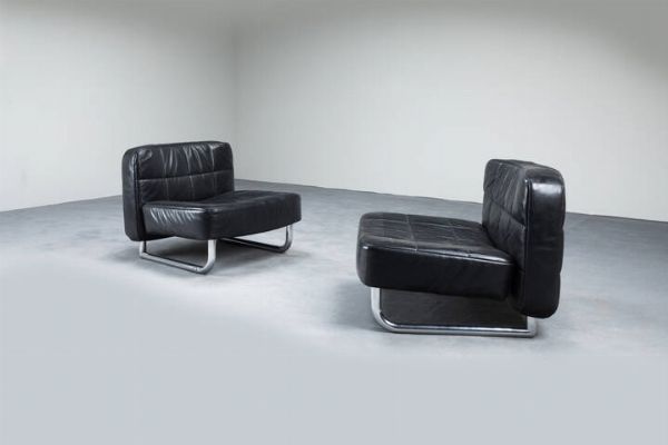Coppia di poltrone con struttura in metallo cromato imbottitura rivestita in pelle. [..]