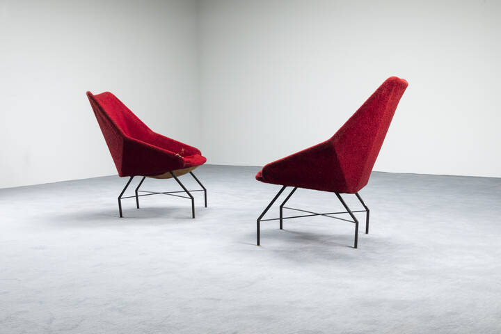 Coppia di poltrone con struttura in metallo verniciato imbottitura rivestita in tessuto. Anni '50 cm 86x64x78
