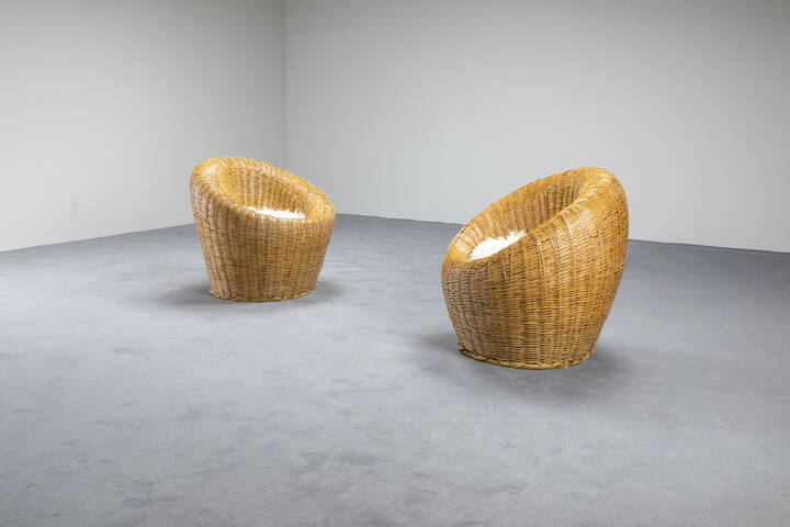 Coppia di poltrone con struttura in vimini intrecciato. Anni '70 cm 80x80x70