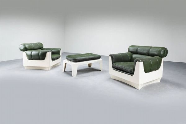 Struttura in fibra di vetro cuscini imbottiti rivestiti in pelle. Prod. Swan anni '70 poltrone cm 71x85x89 pouff cm 31x88x54